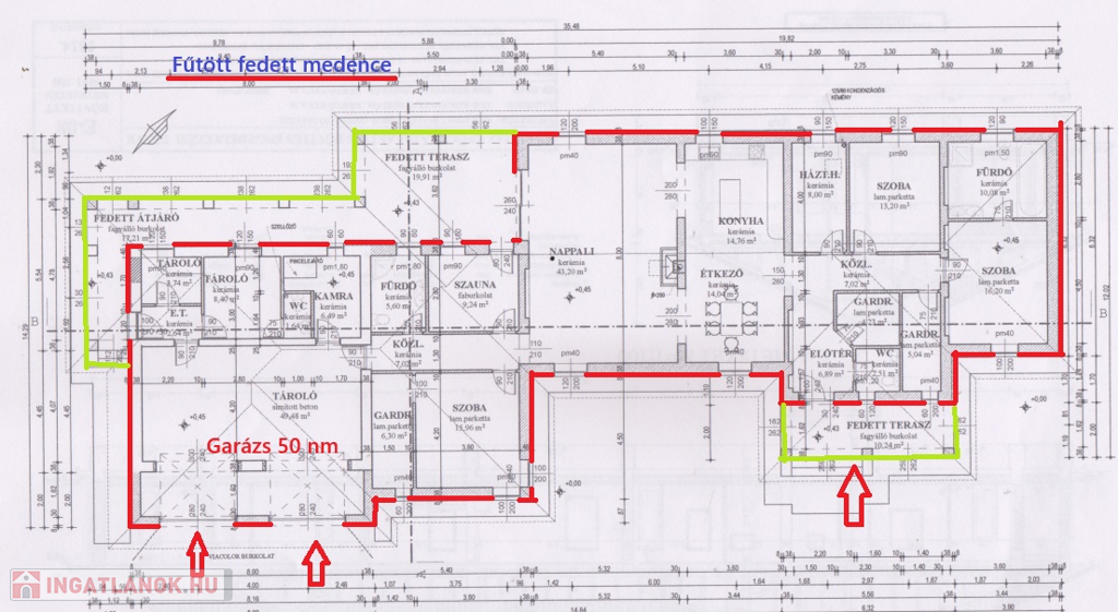Elosztása: fedett bejárat, előszoba, vendég Wc., 2 gardróbszoba, dolgozószoba, szülői hálószoba nagyméretű fürdőszobával kapcsolatos (2 személyes hidromasszázskád, - épített zuhanyzó, dupla mosdó), 2 szoba, nappali + konyha+ étkező (72 nm), 6 személyes infraszauna, zuhanyzóval ellátót fürdőszoba, közlekedő, gépház + mosókonyha, fedett terasz (19.91 nm, 17.21 nm).