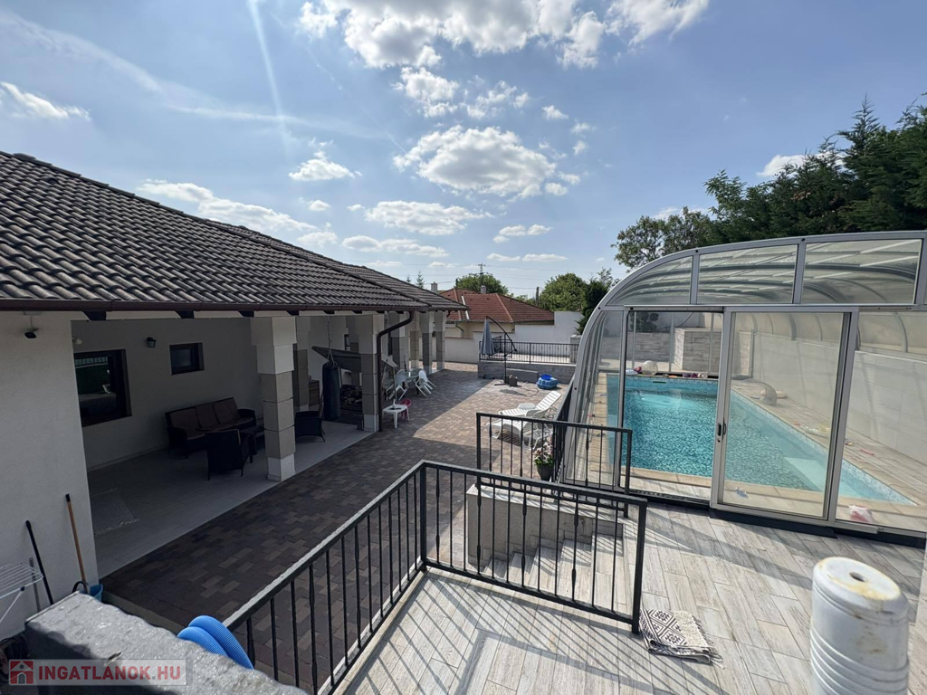 A 1 302 m²-es telek gondosan ápolt, amelyben helyet kapott egy fedett terasz, napozórész, 18 nm-es fedett úszómedence jakuzzi - nyakzuhannyal ellátva, parkosított elő kert locsolórendszerrel.