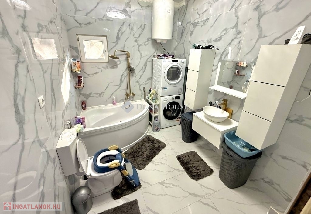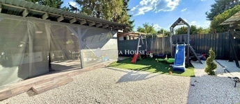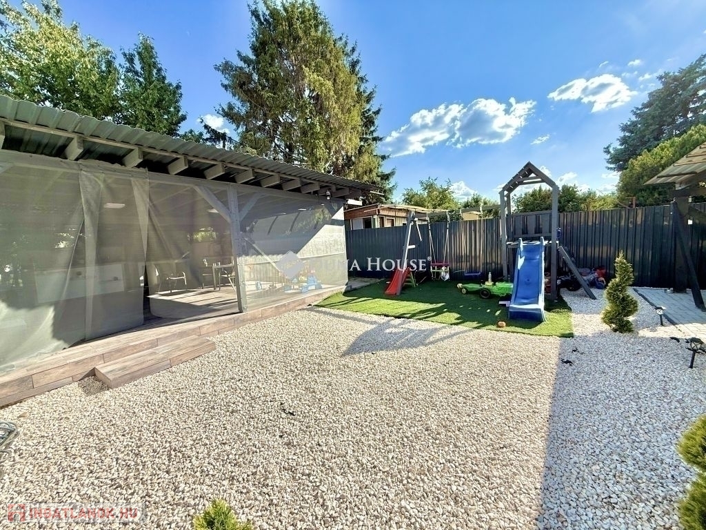 Emellett van egy kisebb, 9 m²-es terasz, valamint egy teljes játszótér is a telek része, így az ingatlan valóban ideális családok számára is.