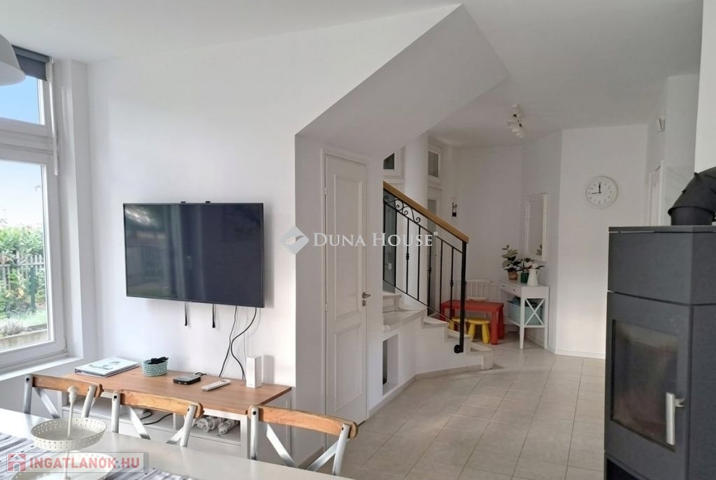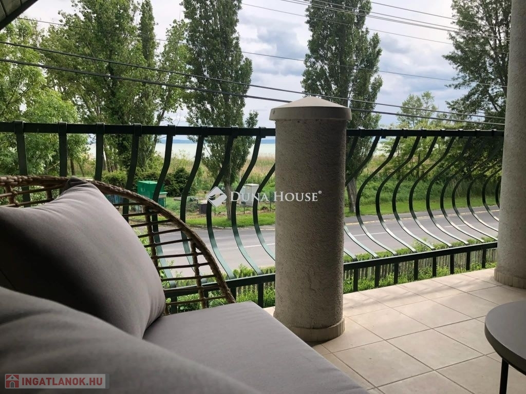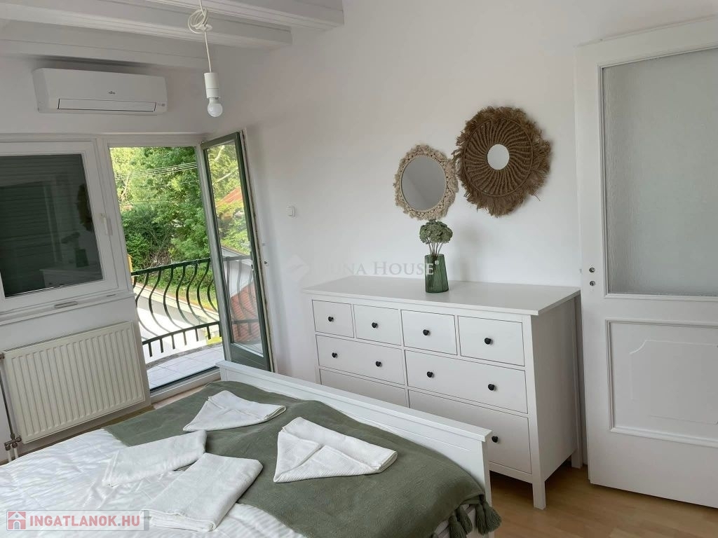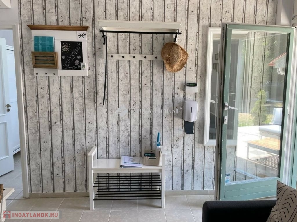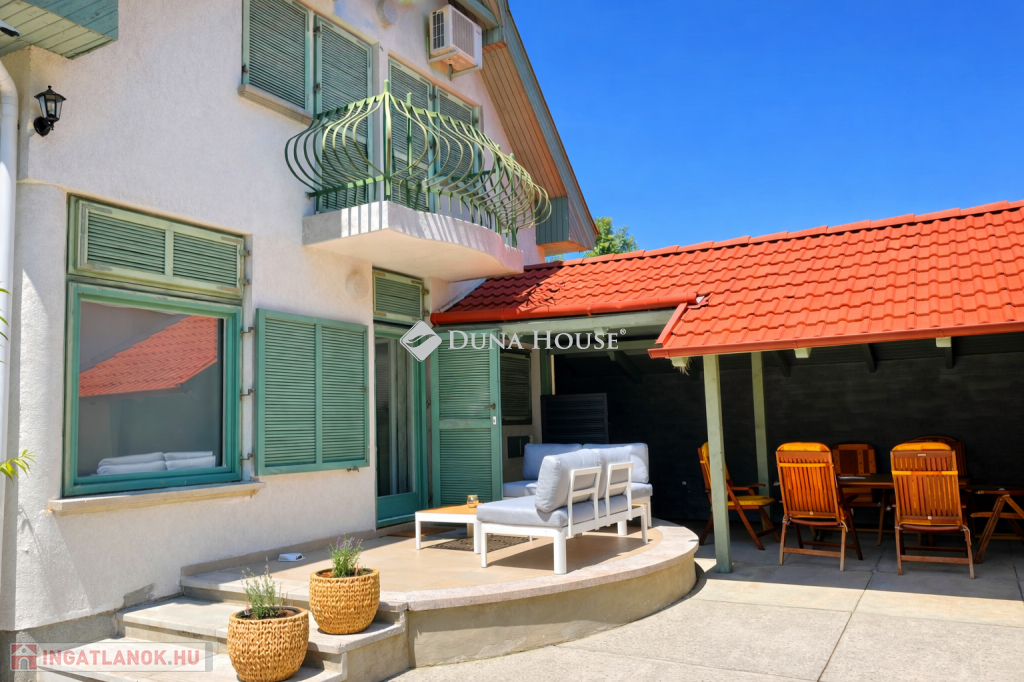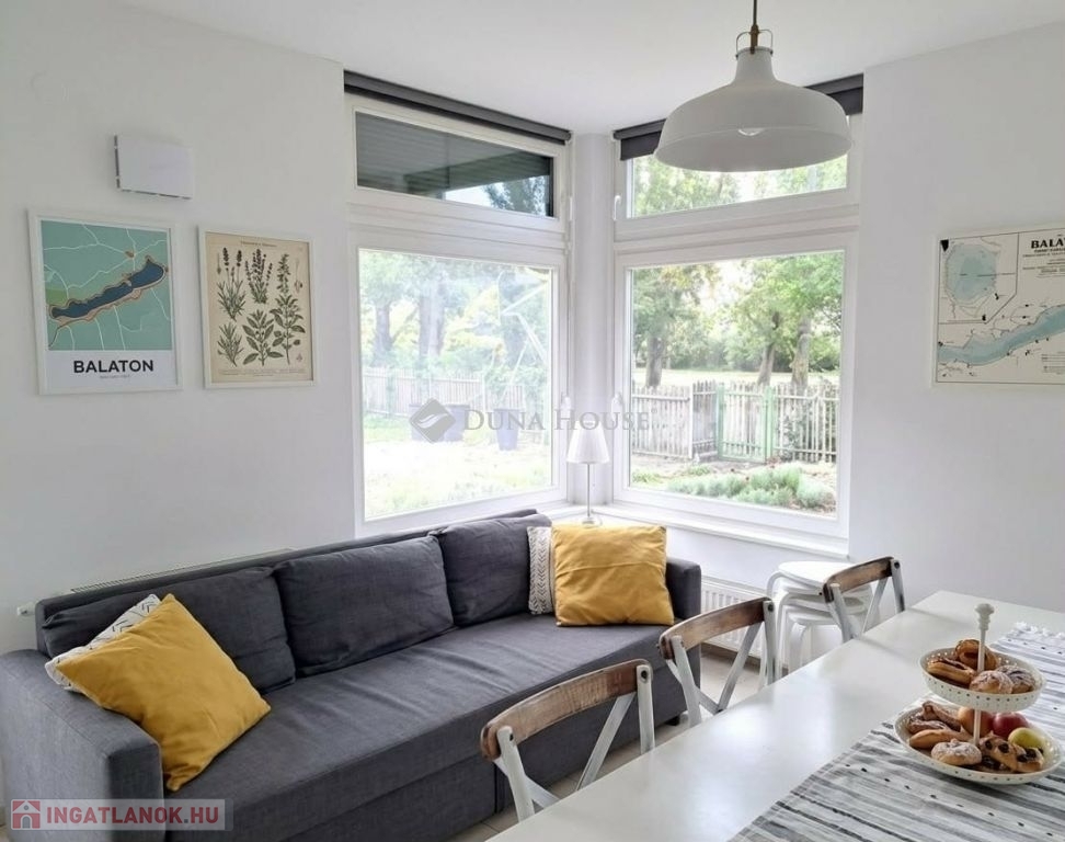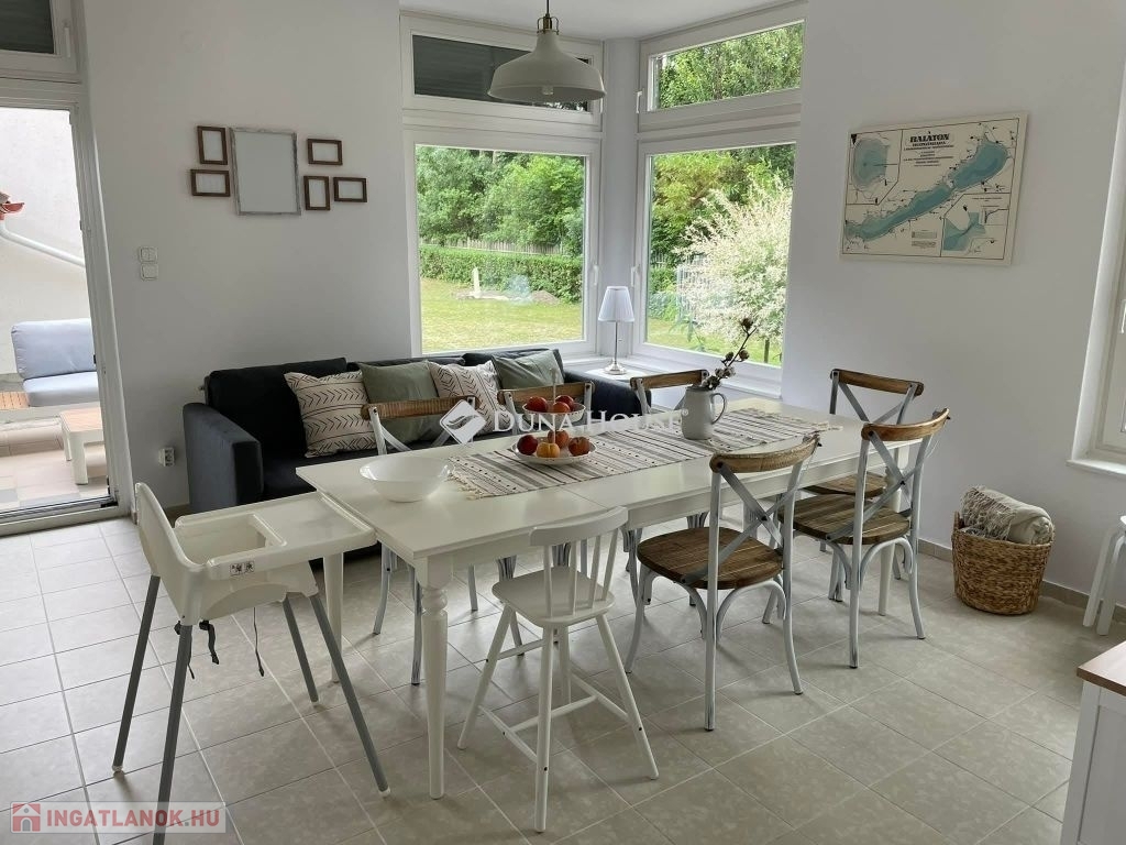 Szigligeten, a Fürdő utcában kínálunk megvételre egy ikerház keleti oldalát, teljesen elkülönített lakrésszel, kivételes elhelyezkedéssel, közvetlenül a Balaton közelében. Az ingatlan előtt futó út túloldalán már a vízpart található, a strand mindössze 120 méterre elérhető, miközben a településen nincs vasúti közlekedés, így a környezet nyugodt és zavartalan.A lakrész nettó 101 m² alapterületű, kétszintes kialakítású, jól használható, átgondolt térszervezéssel. A belső elosztás kifejezetten praktikus: összesen négy hálószoba, egy tágas nappaliétkező, két WC, egy zuhanyzó és egy kádas fürdőszoba áll rendelkezésre, így nagyobb család vagy vendégek fogadására is kényelmesen alkalmas. A felső szinten található egyik hálószobából balatoni panoráma nyílik, ami tovább növeli az ingatlan egyediségét.Az ingatlan jelenleg is sikeresen működő vendégházként üzemel, stabil bevételi lehetőséget biztosítva, így nemcsak saját használatra, hanem befektetésként is kiváló választás.A kertkapcsolat és a külső terek szintén erősítik az ingatlan használati értékét, a több terasz és a balatoni közelség valódi nyaraló hangulatot ad a mindennapokhoz. A kertben dézsa és szauna is kialakításra került, a gondozott zöldfelület fenntartását pedig automata locsolórendszer segíti.A lakrészhez két darab, egyenként 18 m²-es, önálló garázs tartozik, amelyek külön bejárattal rendelkeznek, és az egyikhez elektromos autótöltő tartozik.Műszaki szempontból az ingatlan jó állapotú, a fűtést gázkazán biztosítja, a melegvízellátás villanybojlerrel megoldott. A komfortot négy darab Daikin hőszivattyús klímaberendezés növeli, amelyek távolról is szabályozhatók, így az ingatlan érkezés előtt is a kívánt hőmérsékletre állítható. A működés korszerű és gazdaságos.A biztonságról kiépített kamerarendszer és riasztórendszer gondoskodik, a bejutást elektromos, távirányítással működtethető kapu biztosítja.A lakrészhez tartozó telek megközelítőleg 650 m², amely használati megosztás alapján került kialakításra, a pontos négyzetméter a megvásárlást követően kerül véglegesítésre.A jelen hirdetésben szereplő keleti lakrész mellett a nyugati oldal is megvásárolható, így igény esetén a teljes ingatlan egyben is elérhető, amely további lehetőségeket kínál nagyobb család vagy befektetési célú hasznosítás esetén.Az ingatlan egy helyrajzi számon található, ugyanakkor ügyvéd által készített használati megosztással rendelkezik, a két lakrész egymástól fizikailag is teljesen leválasztott, külön bejárattal és külön közműórákkal használható. A kialakításának köszönhetően használatában egy önálló családi ház érzetét nyújtja.