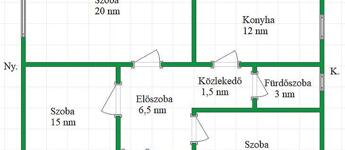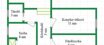 A földszinti lakrész 70 nm, 3 db szoba, konyha, fürdőszoba, előszoba és tároló található.