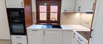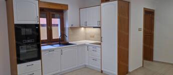 a konyhában egyedi gyártású, beépített konyhabútor fa korpusszal, és elegáns, minőségi MDF frontokkal áll rendelkezésre