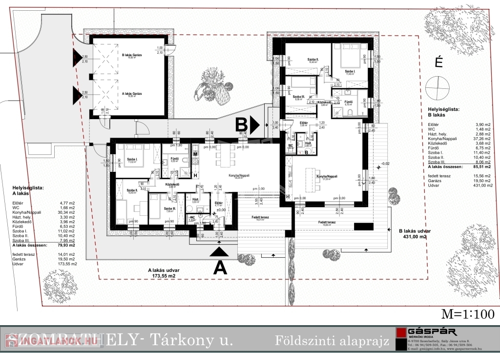 A hirdetésben szereplő "A" lakás 80 m2, 3 háló+ nappali, 14 m2 fedett terasszal, 174 m2 saját kerttel. A garázs bruttó ára 7 239 000 Ft.