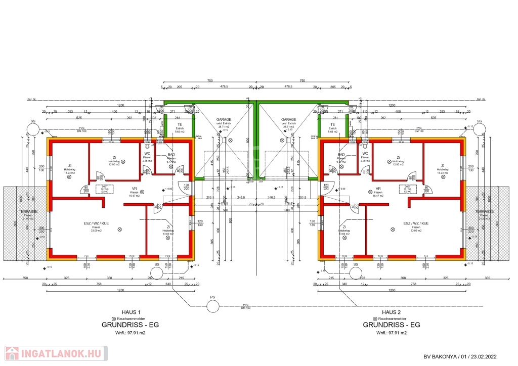 A Magyar határhoz közel, Ausztriában Frankenauban új építésű családi ház eladó. Az ingatlan 6 km távolságra található a Lutzmannsburgi fürdőtől, csendes településen. A ház energetikailag, műszakilag és esztétikailag is megfelel a mai modern követelményeknek. Leier téglából épült, Leier beton födémmel. A tető Terran cseréppel fedett. Homlokzatán 20 cm hőszigeteléssel. Ablakai 3 rétegű, fokozottan hang-és hőszigeteltek, redőny fogadására előkészítve. A fűtése, meleg vízellátása hőszivattyún keresztül történik, padlófűtéses hőleadással. A fürdőszobában törölköző szárítós radiátor is található. Klíma előkészítés megtörtént. Az ingatlan alapterülete 98 m2, terasza 21 m2, dupla állású garázs 29 m2, tároló 5 m2. A házhoz tartozó kert 431 m2, térkövezett, füvesített elektromos kapuval ellátott. A területen kettő ház található, a hirdetésben szereplő ingatlan a 2-es jelű. 66 m2 szolgalmi úton megközelíthető. Az ingatlanok garázson keresztül érintkeznek. Bővebb tájékoztatásért, megtekintés céljából kérem keressen.