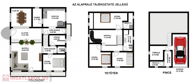 Az ingatlan pince, földszint és tetőtér kialakítású. A pince szinten egy garázs, két tárolóhelyiség és egy kazánház található, amely kiválóan alkalmas tárolásra vagy akár műhely kialakítására is.