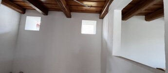 több mint 100 éves fenyő- és tölgyfa mennyezeti gerendák, eredeti parasztfödém