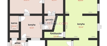 nappali 19,9m2, konyha 13,1m2, fürdőszoba-wc 3,9m2, szoba 12,1m2, előtér 12m2;