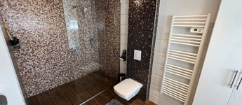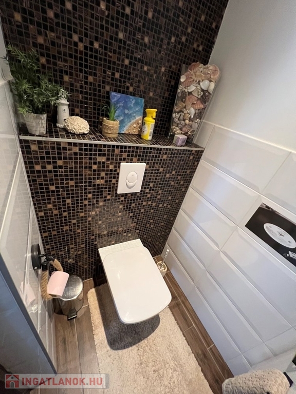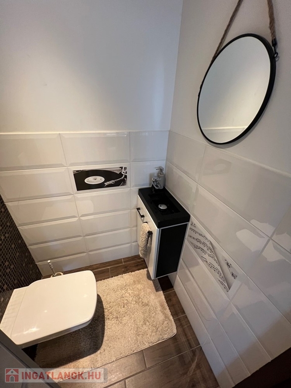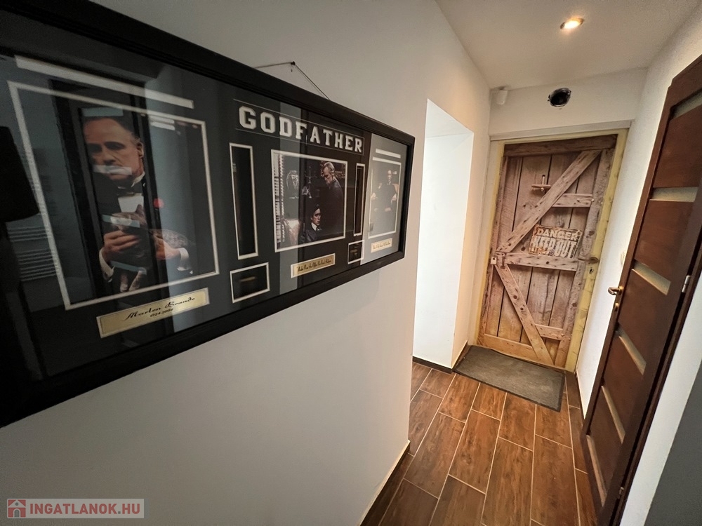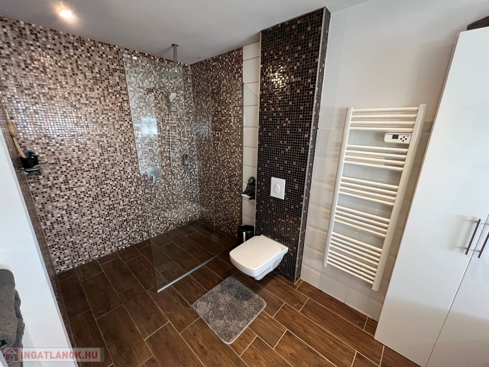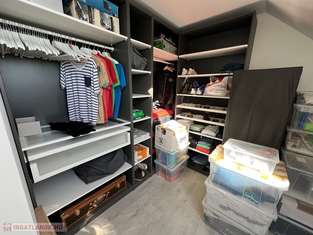 - felső szinten: 1 db gardróbszoba, míg állapotát tekintve jelenleg glettelésre és festésre előkészített gipszkartonos kialakítással 1 db hálószoba, nappali – társalgó, fürdőszoba – WC helyiségekből áll.