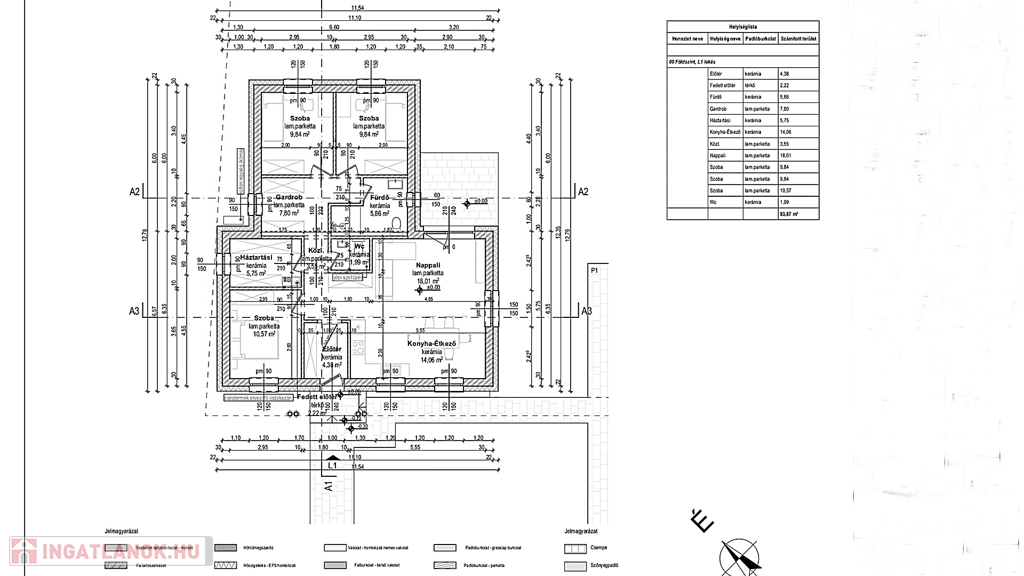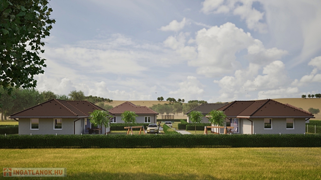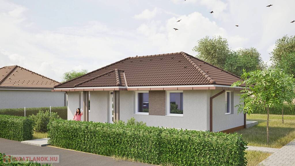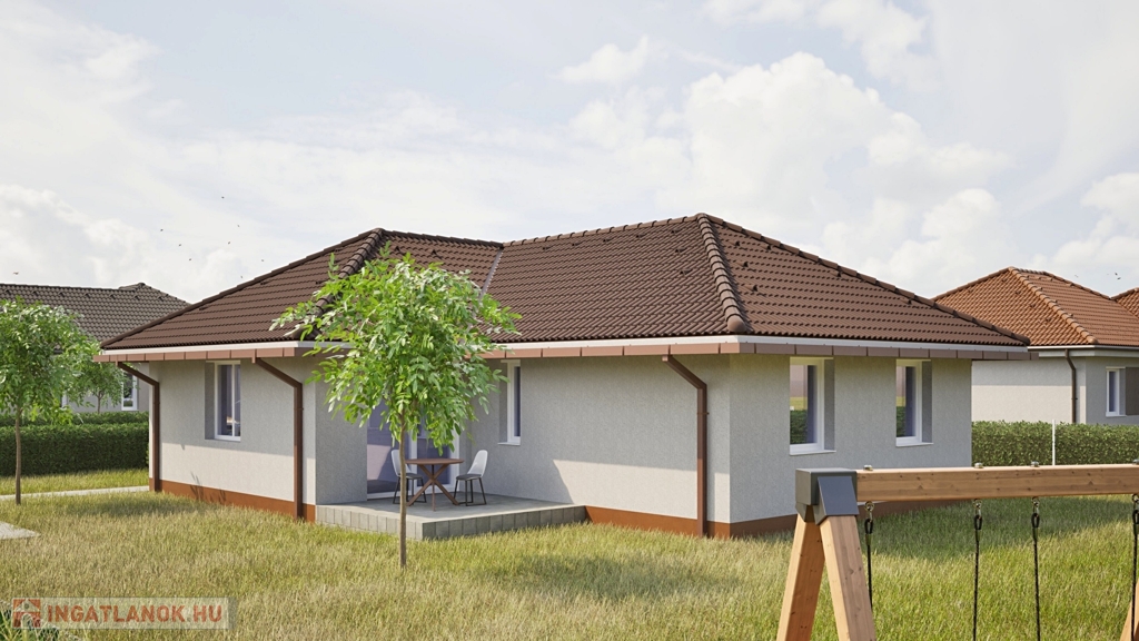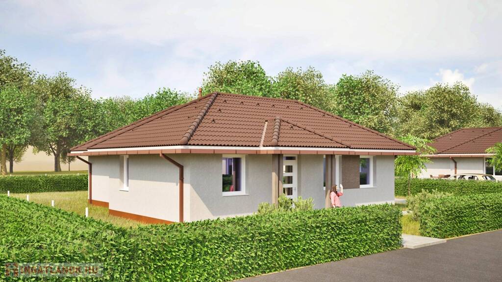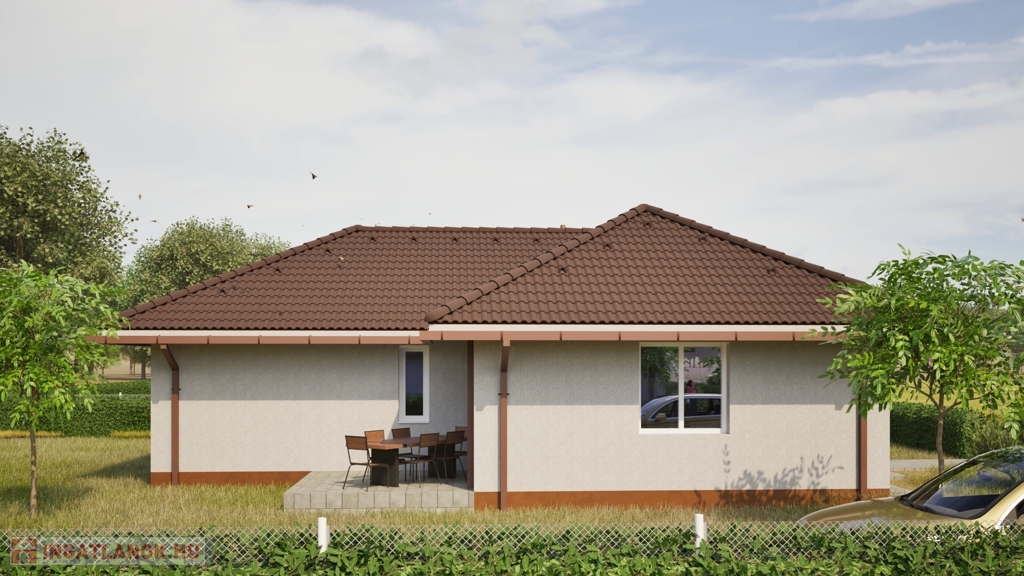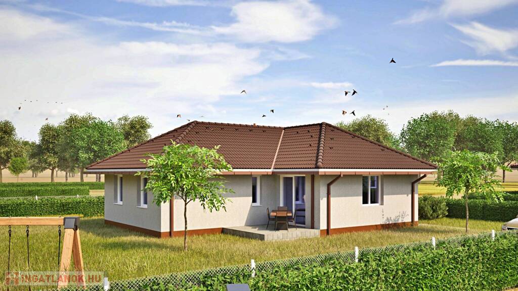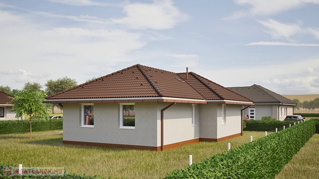 A ház helyiségei: amerikai konyhás nappali, 3 hálószoba, fürdő WC-vel, külön WC, kamra, háztartási helyiség, gardrób, előszoba, közlekedő, előtér, fedett előtér.