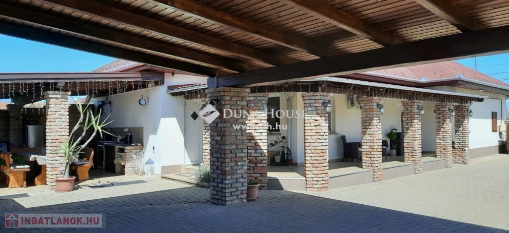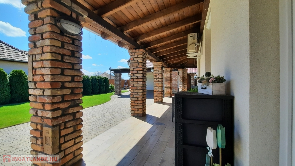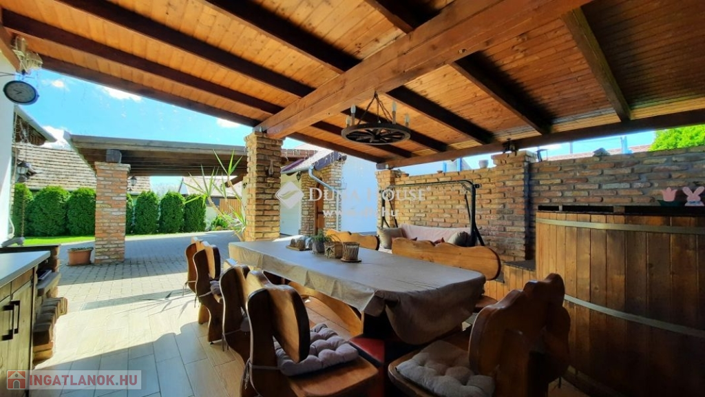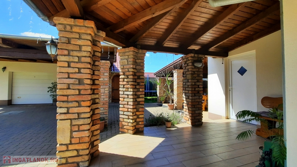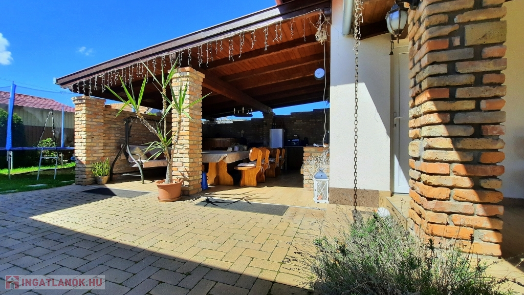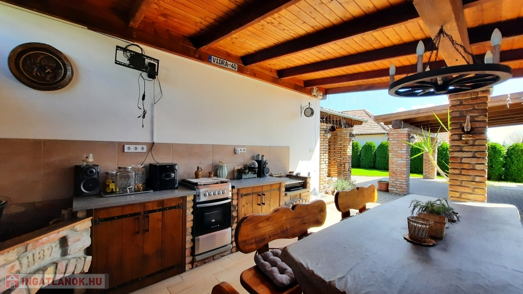 Nagy hangsúlyt fektettek a külső térre is, ahol kialakításra került egy nagyon hangulatos, rusztikus, bontott téglás kerti kiülő konyhával, dézsa fürdővel, fedett terasz és egy dupla garázs, mely alatt pince található, előtte fedett autó beálló található.