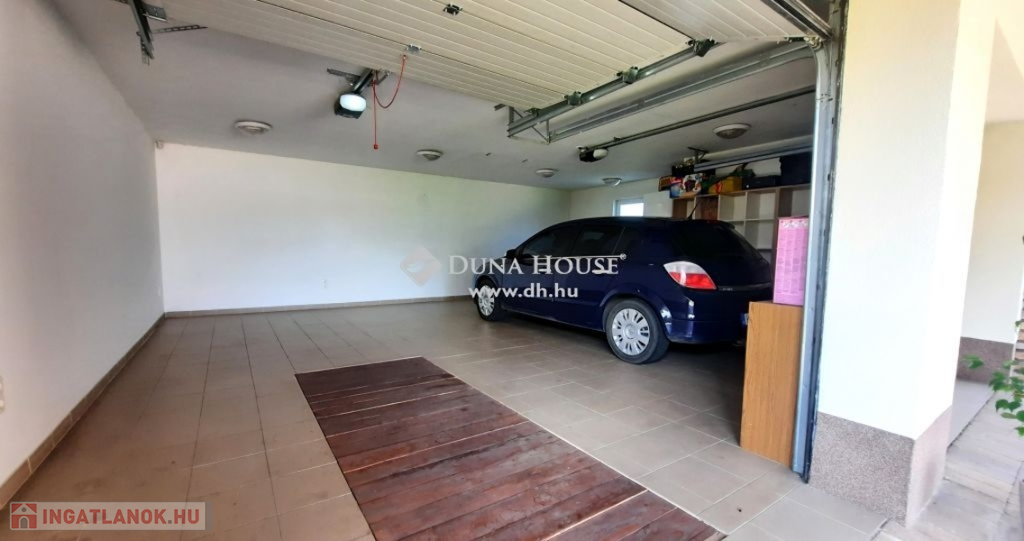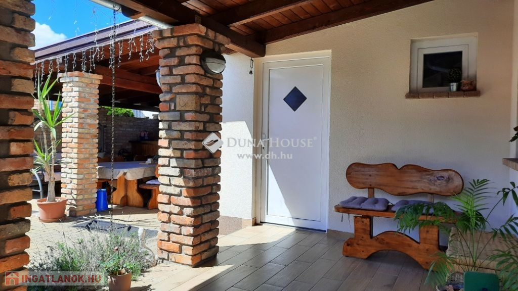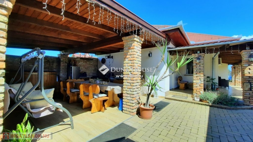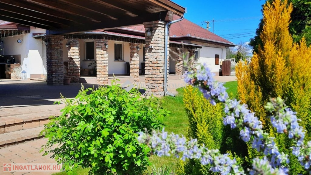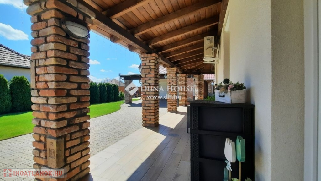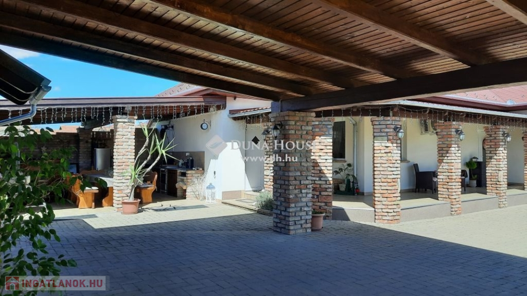 Nagy hangsúlyt fektettek a külső térre is, ahol kialakításra került egy nagyon hangulatos, rusztikus, bontott téglás kerti kiülő konyhával, dézsa fürdővel, fedett terasz és egy dupla garázs, mely alatt pince található, előtte fedett autó beálló található.
