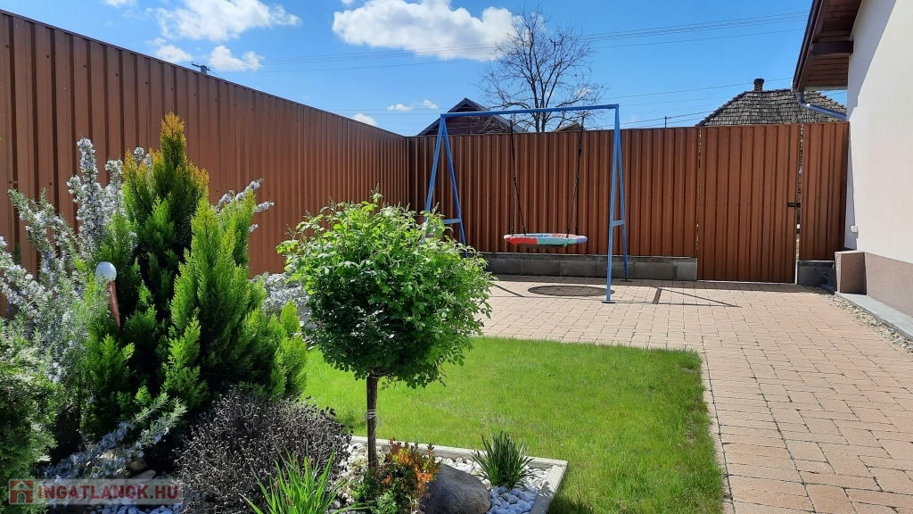 Az udvar egy része térkővel burkolt és parkosított, a hátsó rész, mely külön bejárattal is rendelkezik a másik utcáról, veteményes kert, de itt található egy 36 nm-es lemez garázs is. A családi ház összközműves és a növények öntözése fúrt kútról történik.