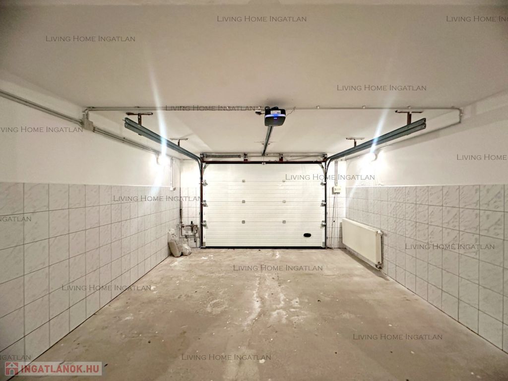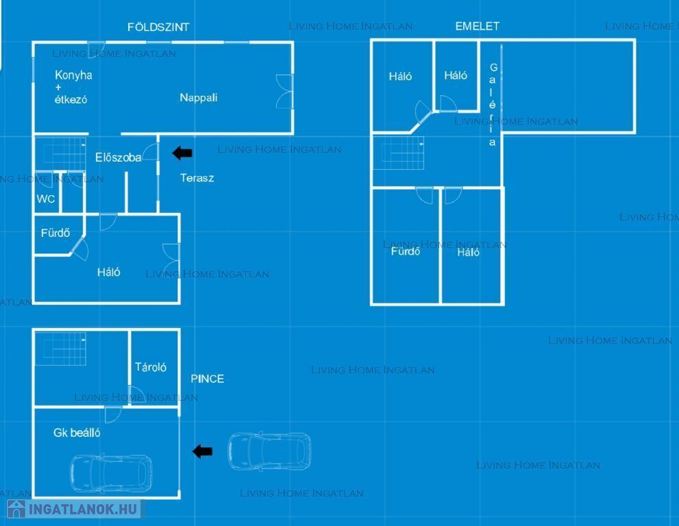Pinceszint: elektromos kapuval ellátott kétállásos garázs, melyből közvetlen bejutás biztosított a házba, gépészeti helyiség, tárolók, gardrób, kamra mosógép kiállással.