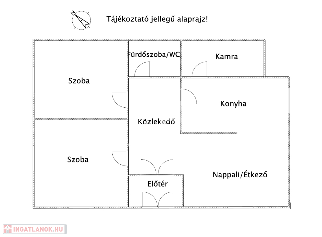 - Az egy szintes ingatlanba található: előszoba, 3 szoba, nappali/étkező, konyha, spájz, fürdőszoba, WC