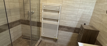 A ház fűtésére több lehetőség is kiépítésre került: megoldható hőszivattyús rendszerrel, elektromos kazánnal ill. egy cserépkályha is helyet kapott a fsz-i nappaliban.