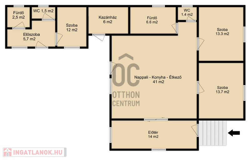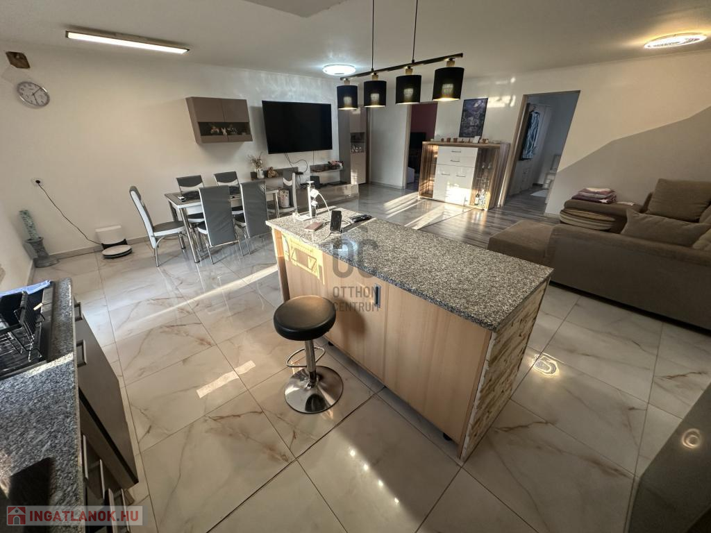 A burkolatok és a helyiségek elosztása a mai, modern igényeknek megfelelő, ezt az érzetet tovább fokozza az amerikai konyhás nappali.