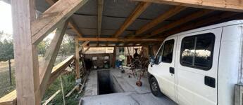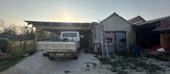 Az épület mellett található egy garázs, egy fedett beálló, amely 2 gépkocsi számára biztosít helyet.