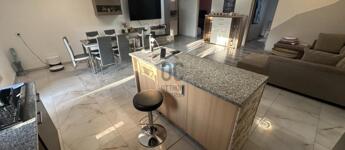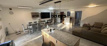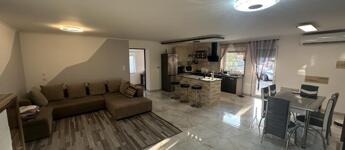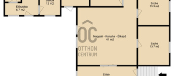 A burkolatok és a helyiségek elosztása a mai, modern igényeknek megfelelő, ezt az érzetet tovább fokozza az amerikai konyhás nappali.