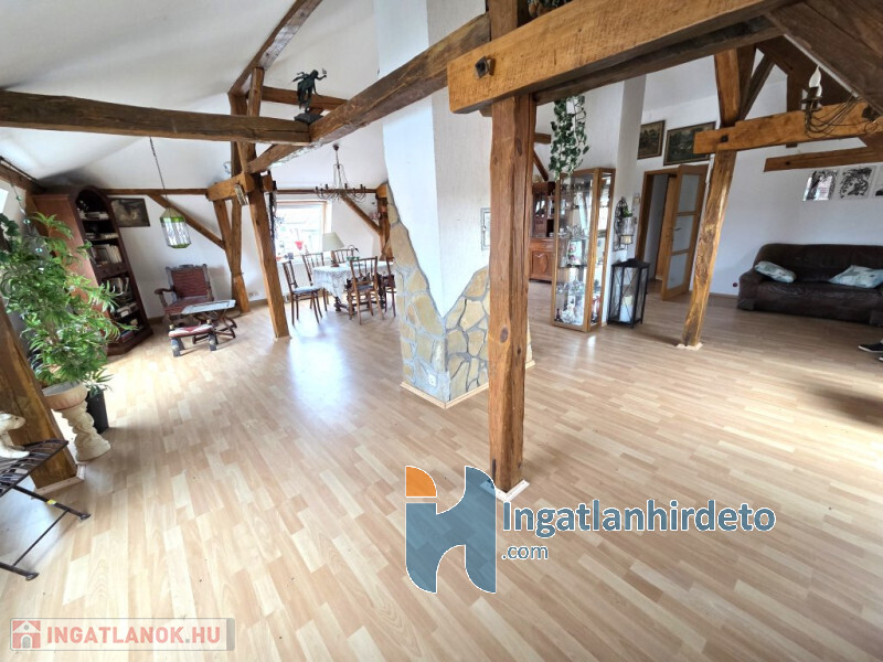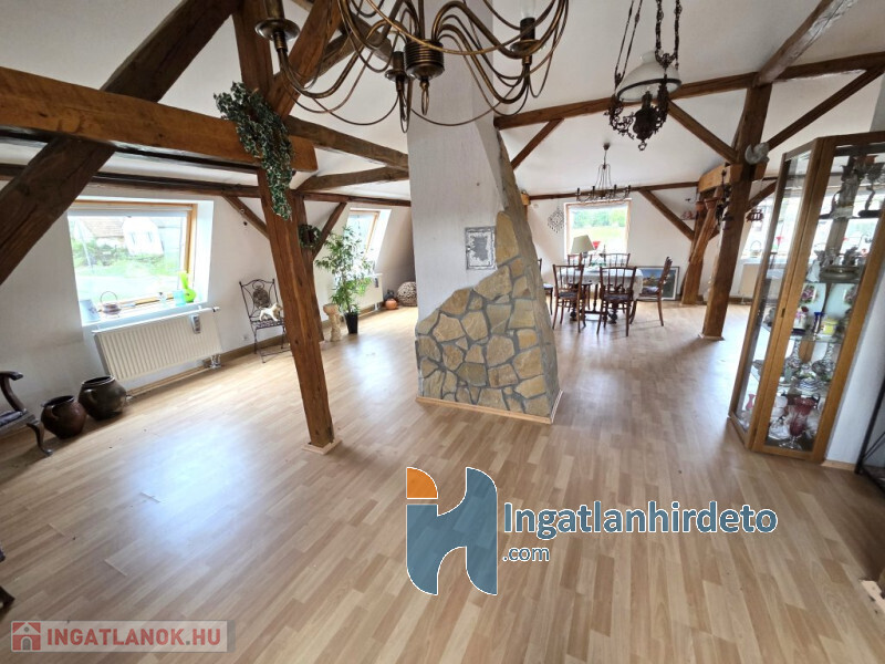 A tetőtérben egy tágas, napfényes, lakó-hálószoba 50 m2, konyha 5 m2, fürdő-WC 5 m2 és közlekedő 3 m2 került kiépítésre.
