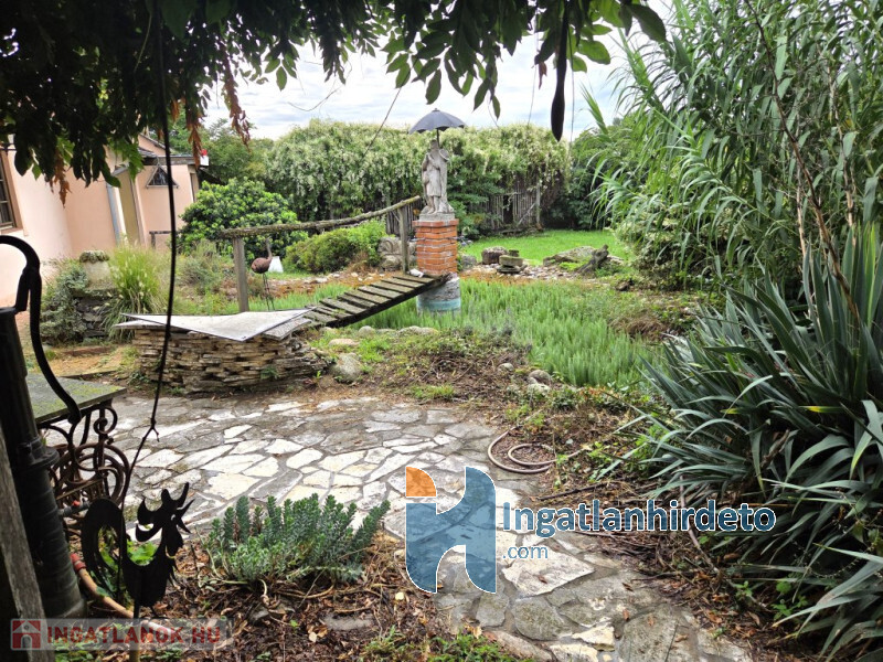 Az 1000 m2-es terület díszbokrokkal és díszfákkal, saját kútból táplált kerti tóval kellemes magánéletet kínál.