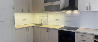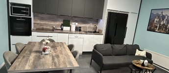 terasz felől jutunk be a lakótérbe, amely belépő, közlekedő, tágas, gépesített konyha-nappali, minőségi