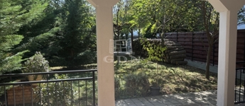 terasz előtt egy kellemes méretű, örökzöldekkel és rózsaszín akácokkal gazdagon beültetett, nyáron zöld