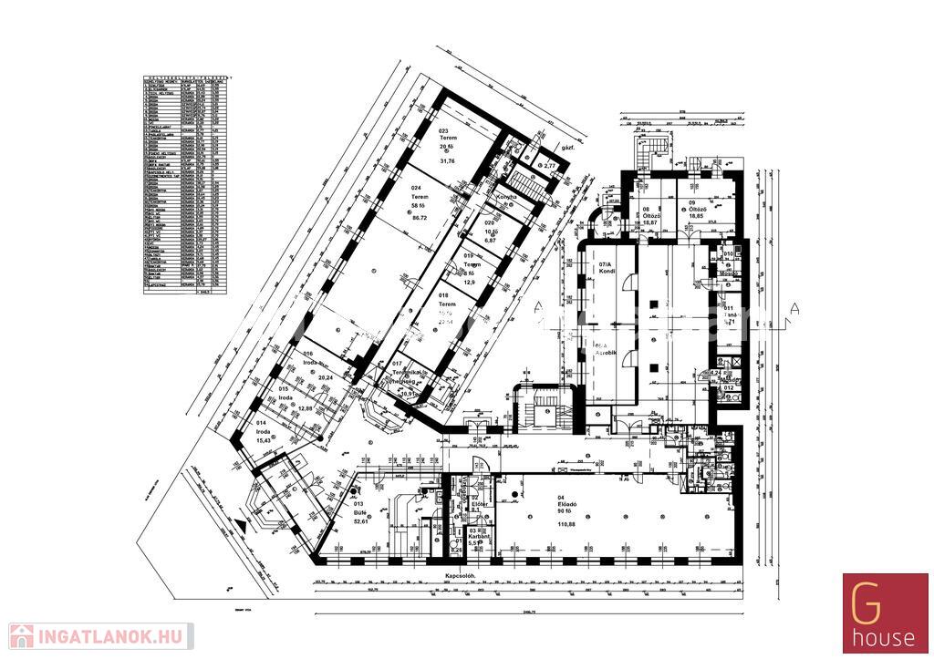 Földszint 848 nm: aula/recepció, 9 kisebb-nagyobb terem/iroda 8-56 fős+ 90 fős előadóterem, mosdók, büfé, teakonyhák, tornaterem zuhanyzós öltözőkkel.