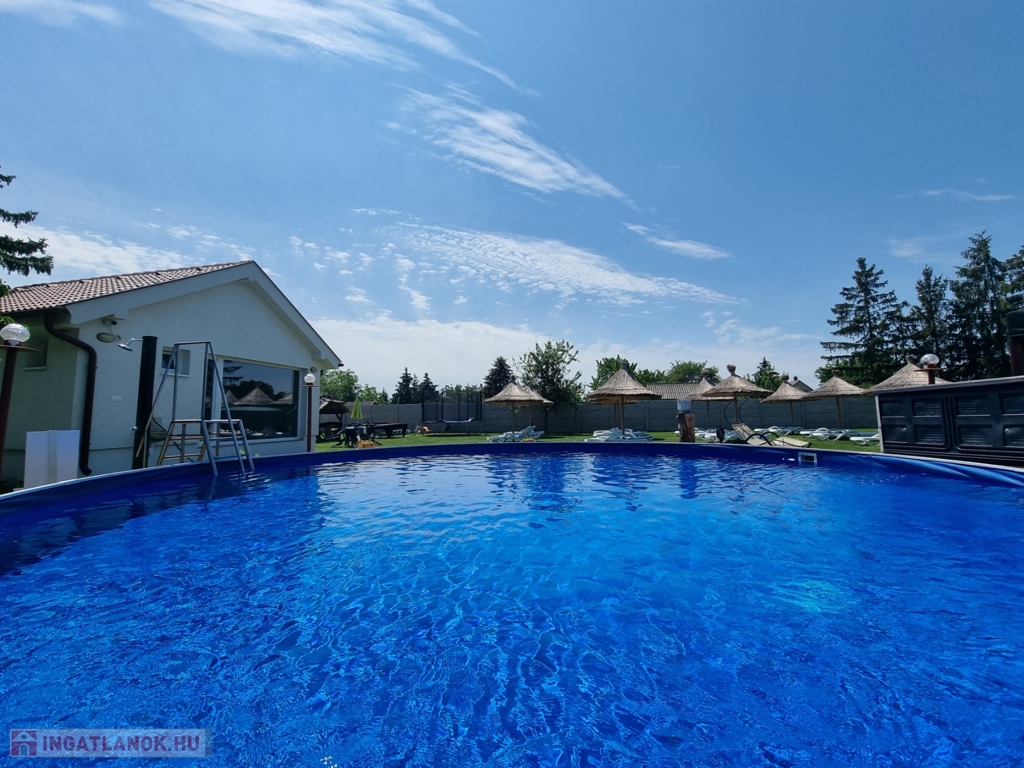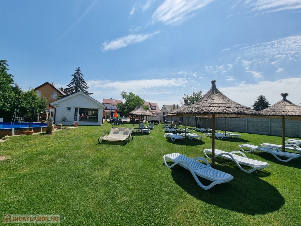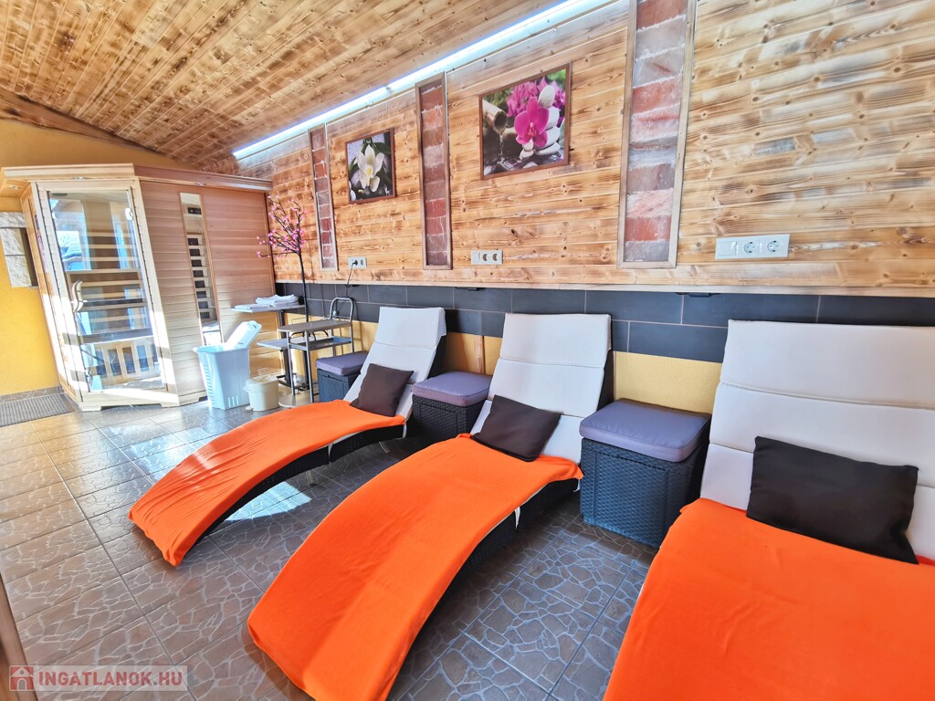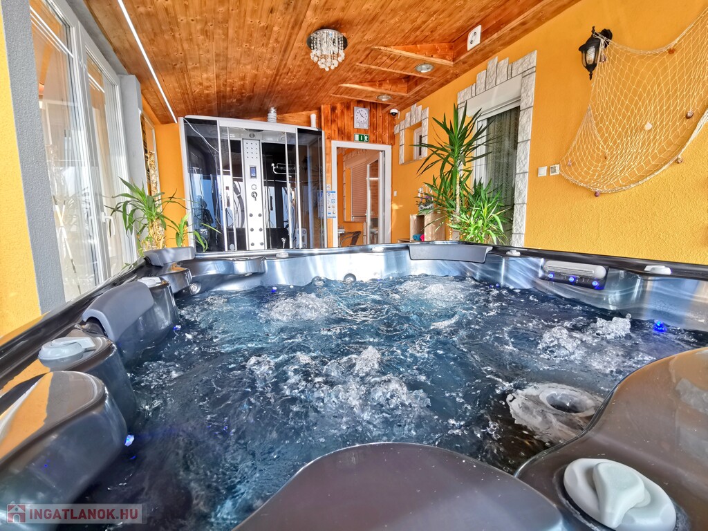 GŐZKABIN, KÜLTÉRI MEDENCE, FITNESS TEREM, FÜRDŐDÉZSA, KERTI PIHENŐK, GYERMEKJÁTSZÓK,