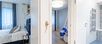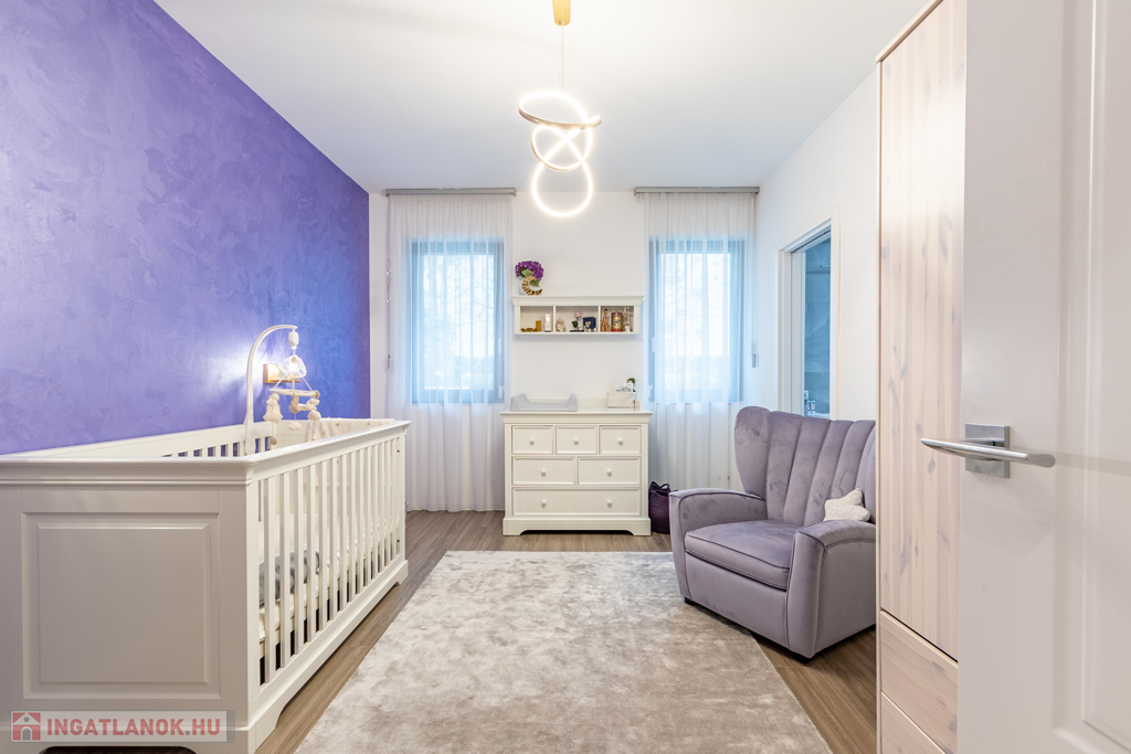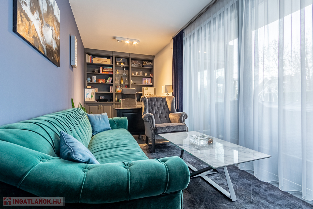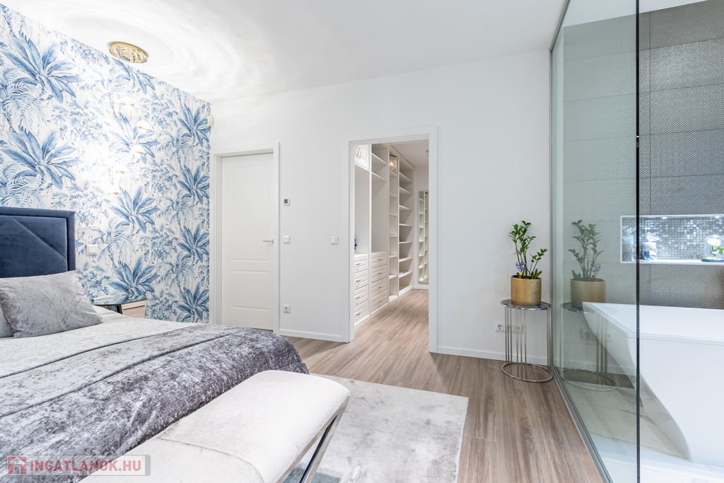 A közlekedőből nyílik további egy hálószoba, és egy kádas fürdőszoba, valamint a szülői apartman - ami egy egyedi megjelenésű -, üvegfallal leválasztott látványfürdővel, design térkáddal, dupla mosdóval, illetve járható gardróbbal is rendelkezik.