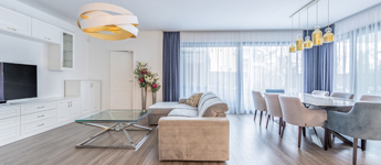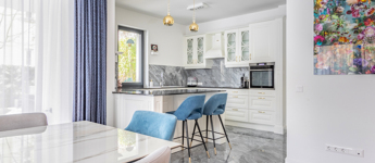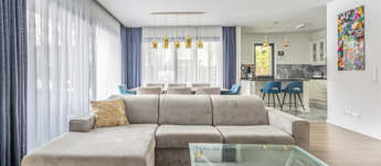 Elrendezése ideális család számára: a közösségi térben tágas (44 nm-es), nappali–étkező, a részben szeparált, világos, ablakos, étkező pulttal épített konyhával, gránit munkalappal, klasszikus fehér frontokkal és teljes körű gépesítéssel, kényelmesen használható toronyba épített sütővel.