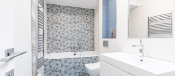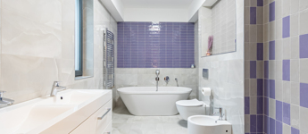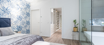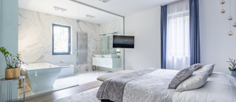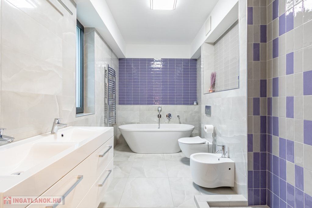 Itt kapott helyet egy nagyméretű hálószoba saját fürdőszobával, dupla mosdóval és szabadon álló káddal.