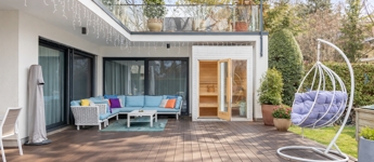A nappaliból közvetlen kijárat nyílik a részben fedett, 48 nm-es teraszra, amely egybefügg a 79 nm burkolt kertfelülettel, így összesen 127 nm teraszként használható élettér áll rendelkezésre, továbbá 184 nm kizárólagos használatú saját kertrész is tartozik az ingatlanhoz.