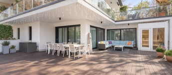 A földszinti, részben fedett terasz valódi szabadtéri nappali: 12 személyes étkezőasztal, kültéri lounge, finn szauna, napozóágyak, függőfotel és gyermekjátszótér teszi teljessé az élményt.