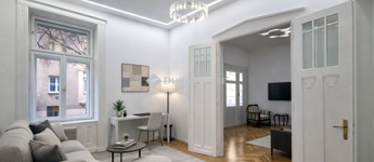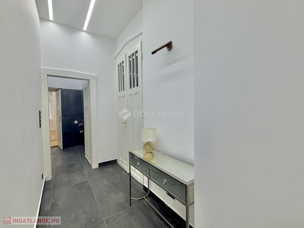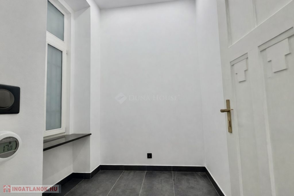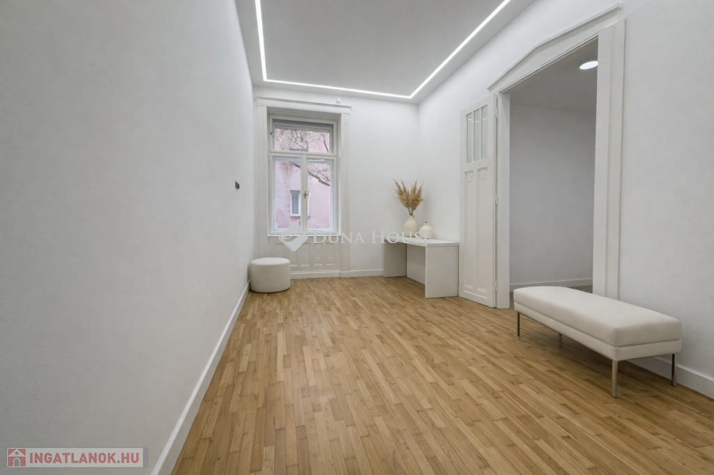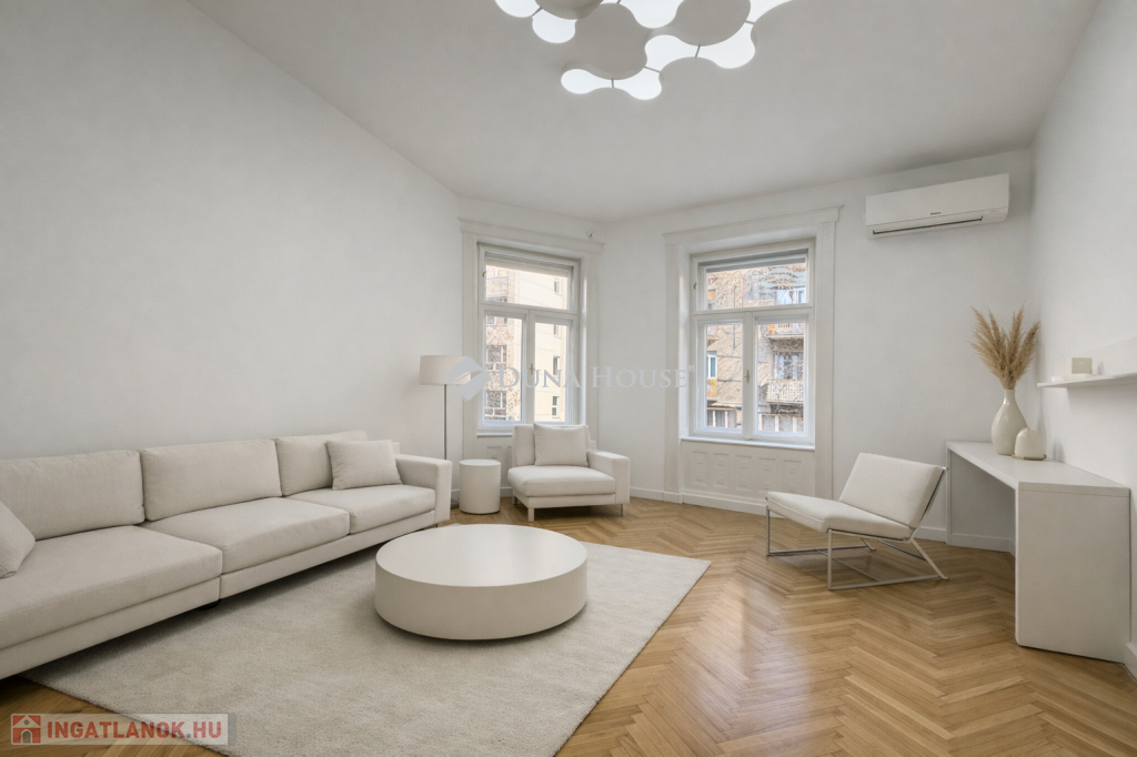 Ebben a környezetben kínálunk megvételre egy 100 m²-es, igényesen felújított lakást, amely egy liftes, téglaépítésű társasház félemeletén található. A 3 métert meghaladó belmagasság és a jól átgondolt térszervezés kellemes, tágas térérzetet ad az ingatlannak.