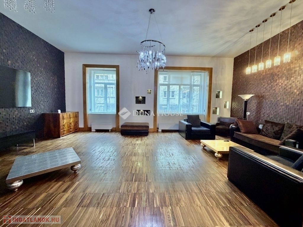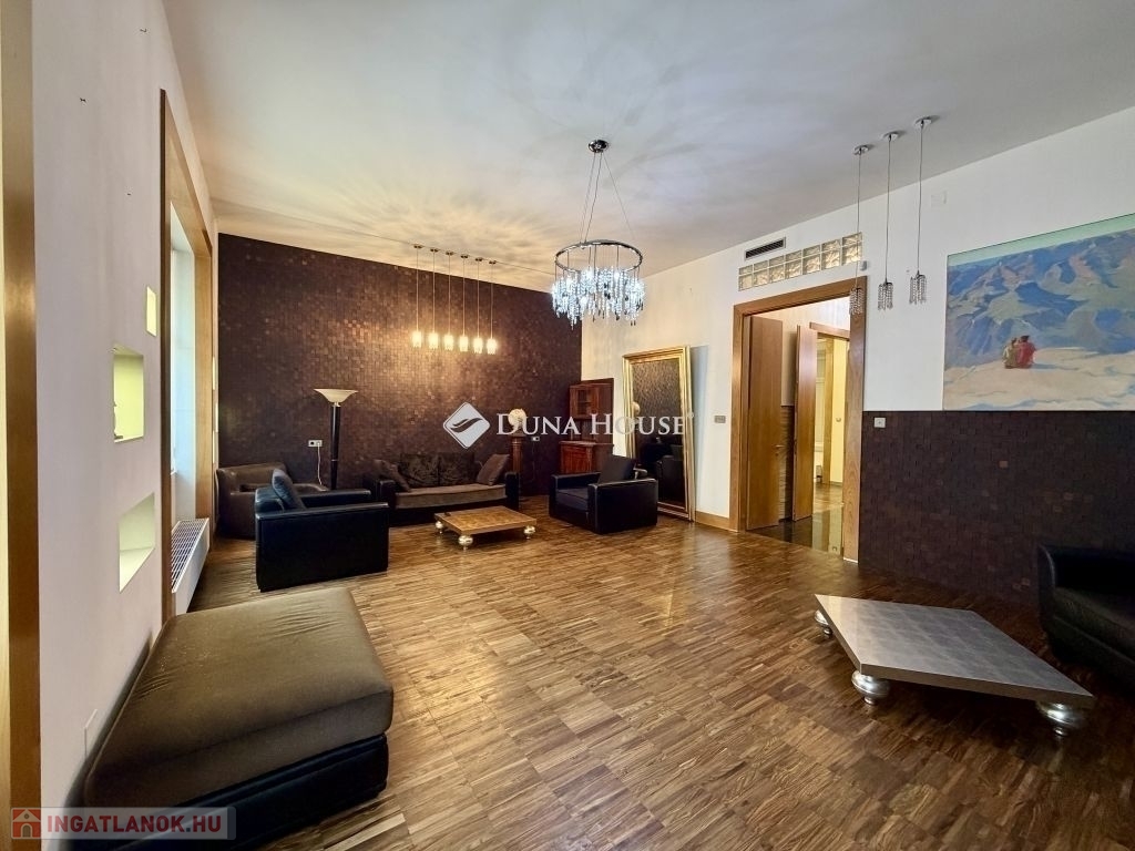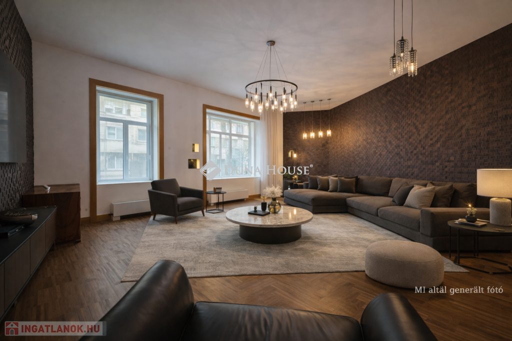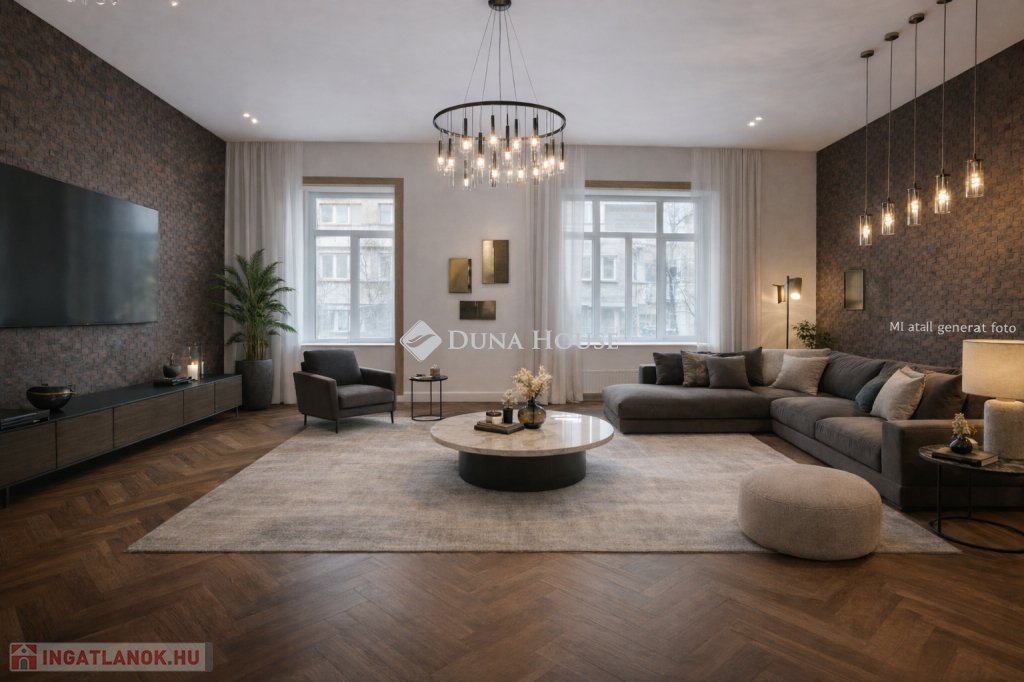 A lakás központi tere egy nagyméretű, tágas nappali, amely világos és reprezentatív életteret biztosít.