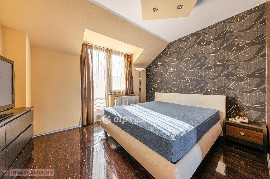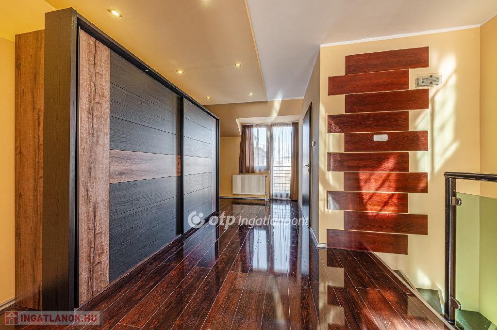 Felső szint: Egy kényelmes hálószoba, egy tágas dolgozószoba (ami könnyedén második hálószobává alakítható!), valamint egy zuhanyzós fürdőszoba és beépített szekrények biztosítják a privát szférát.