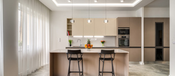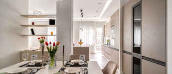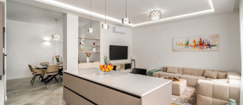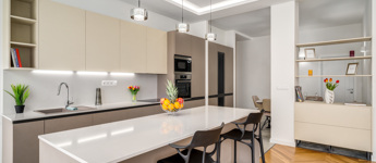 Tágas nappali, étkező, modern konyha, két hálószoba, két fürdőszoba