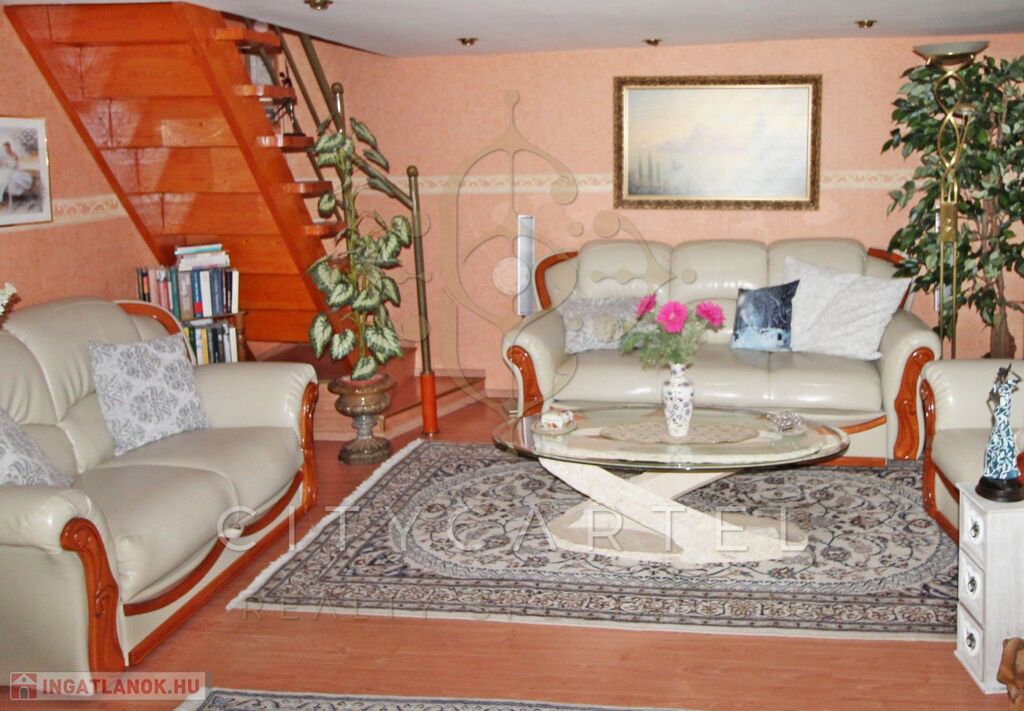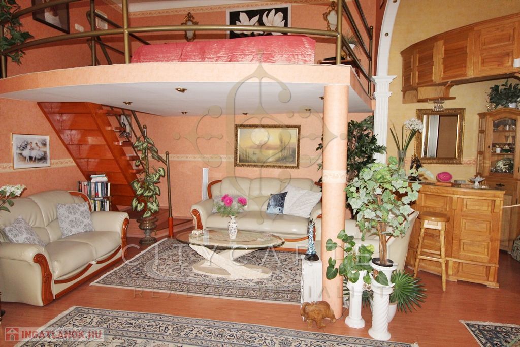 A kb. 34 nm-es, tágas nagy belmagasságú nappali galériázott, világos (kis bárpult rész is ki van benne alakítva), innen jutunk át a szintén galériázott, kb 13 nm-es hálószobába.