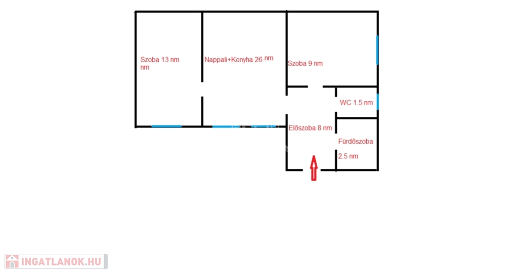 Az előszoba ajtóval szemben találjuk a 10 nm-es szobát, bal oldalon lépünk a 26 nm-es amerikai konyhás nappali helyiségbe, innen nyílik a 13 nm-es hálószoba.