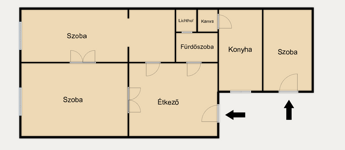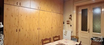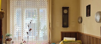 A lakás teljes körű felújítást igényel, az elosztása rendkívül praktikus: két bejárattal rendelkezik, az egyik a konyha melletti galériázott cselédszobából nyílik. A bejáratból tágas előtérbe lépünk, ahonnan az étkező és beépített, falig érő szekrénysor fogad. Innen egyenesen a nagyobbik szobába jutunk, majd egy átjárón keresztül elérjük a másik szobát is, ahonnan visszakanyarodhatunk az étkezőbe.