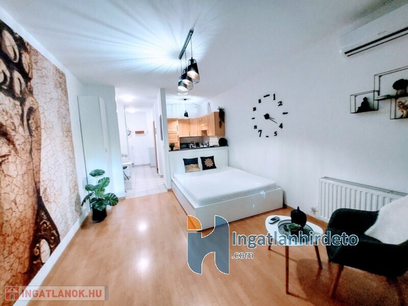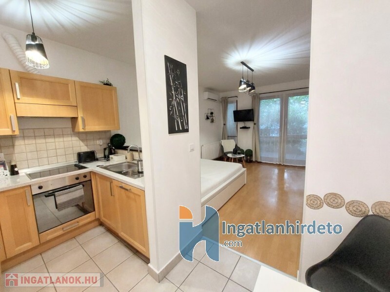 Az ingatlan lakóterülete 32 nm, mely tágas, zuhanykabinnal ellátott fürdőszobából, a szobától elszeparált de mégis nyitott konyhából, és parkosított udvarra néző szobából áll.