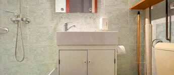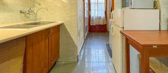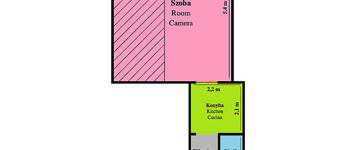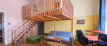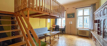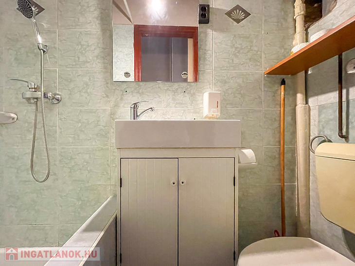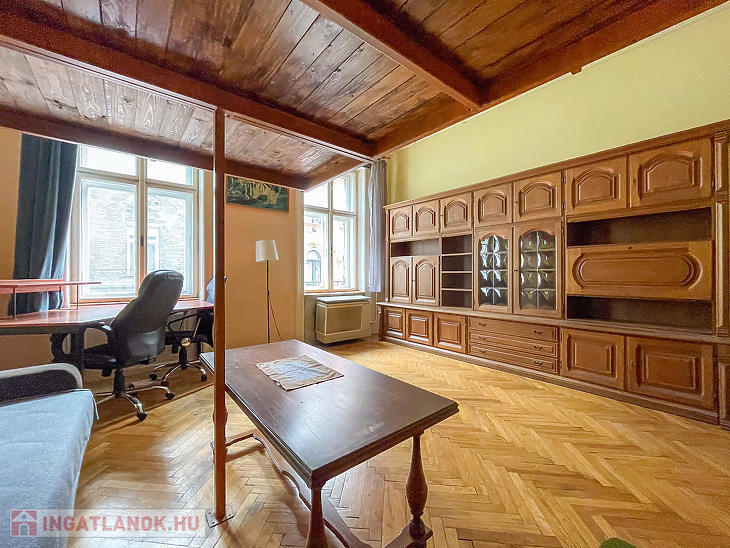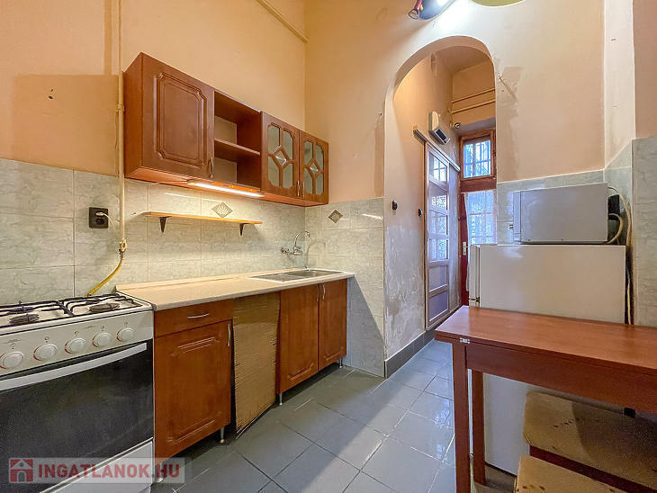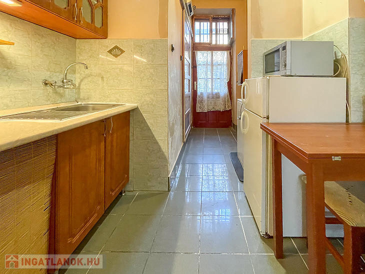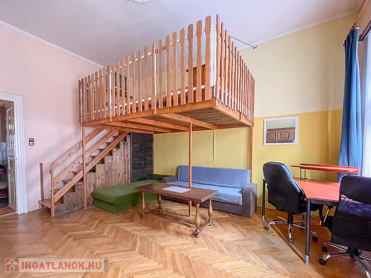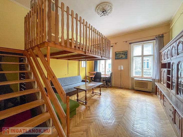 A faparkettás, két ablakos szoba igény szerint leválasztható, jelenleg a 3,65 m belmagasságot kihasználva hálógaléria került kialakításra. A fürdőszoba zuhanyzós, a konyha praktikus elrendezésű.