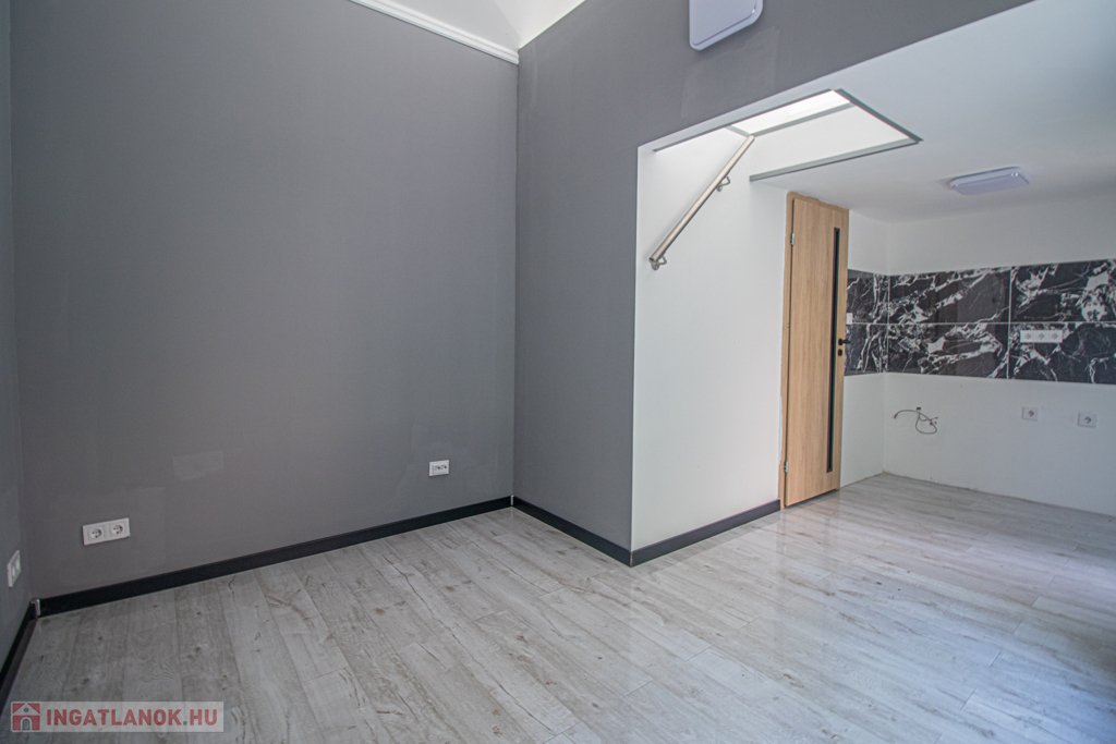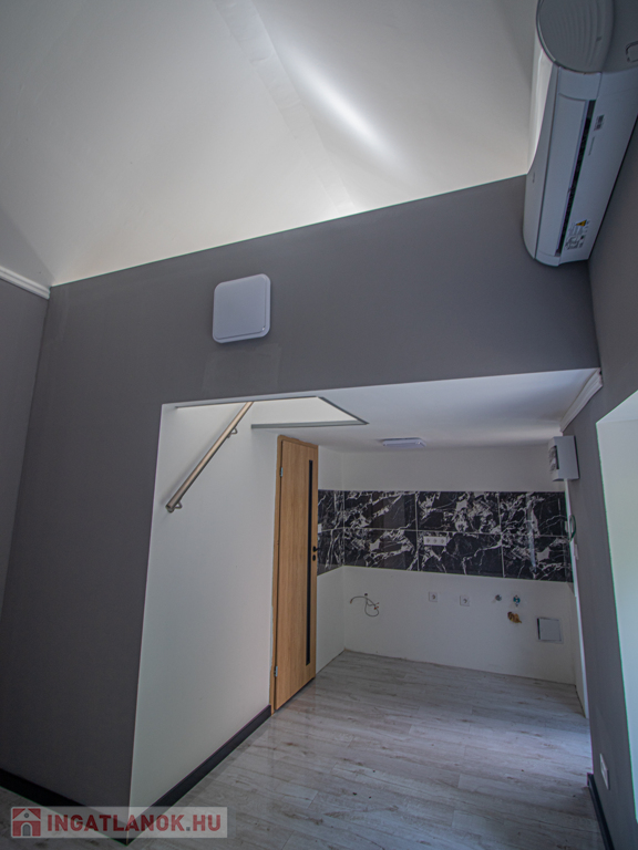 A lakás belső kétszintes, alul található a konyha, nappali, fürdő, wc, fent pedig a hálószoba.