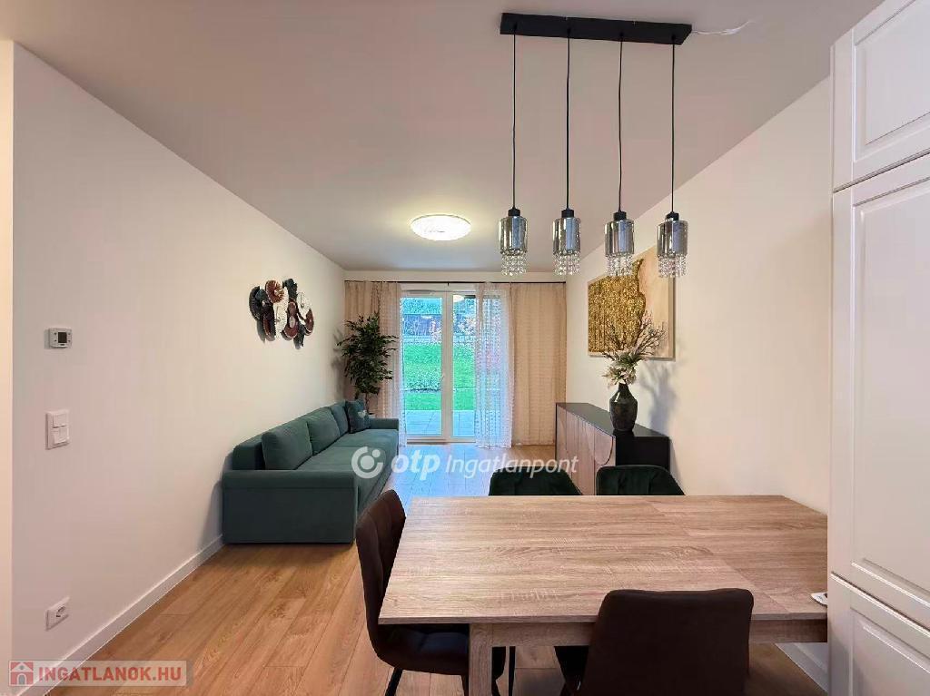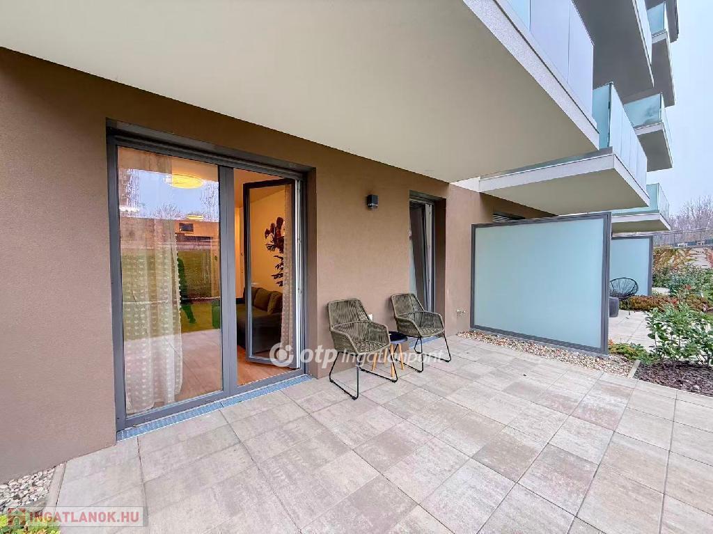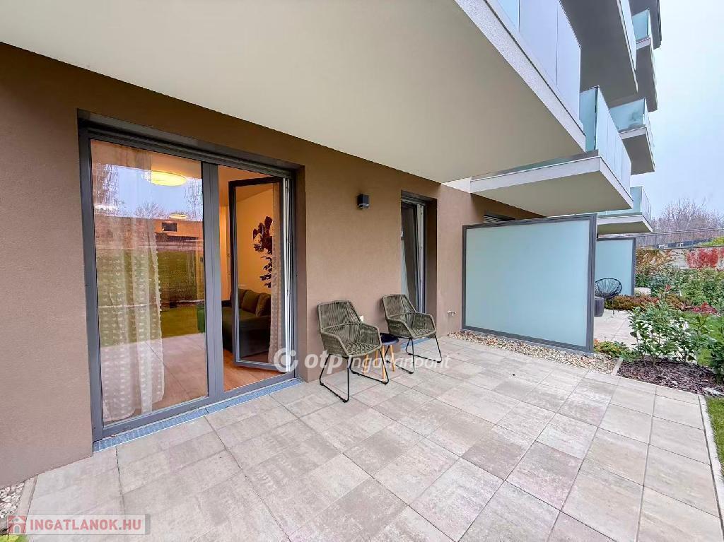 A modern építészeti irányzatoknak megfelelő, liftes, négyemeletes társasház kifinomult megjelenésű és praktikus elrendezésű. A biztonságos, zárt és ízlésesen kialakított lépcsőházból a tágas, beépített gardróbbal ellátott előszobába léphetünk. Bal oldalon található a kádas fürdőszoba, egy különálló tárolóhelyiség, valamint a hálószoba. A lakás központi része a világos, keleti fekvésű, amerikai konyhás nappali, amely közvetlen kijáratot biztosít a teraszra és a gondozott kertre, mind a nappaliból, mind a hálóból megközelíthetően.