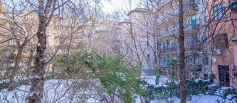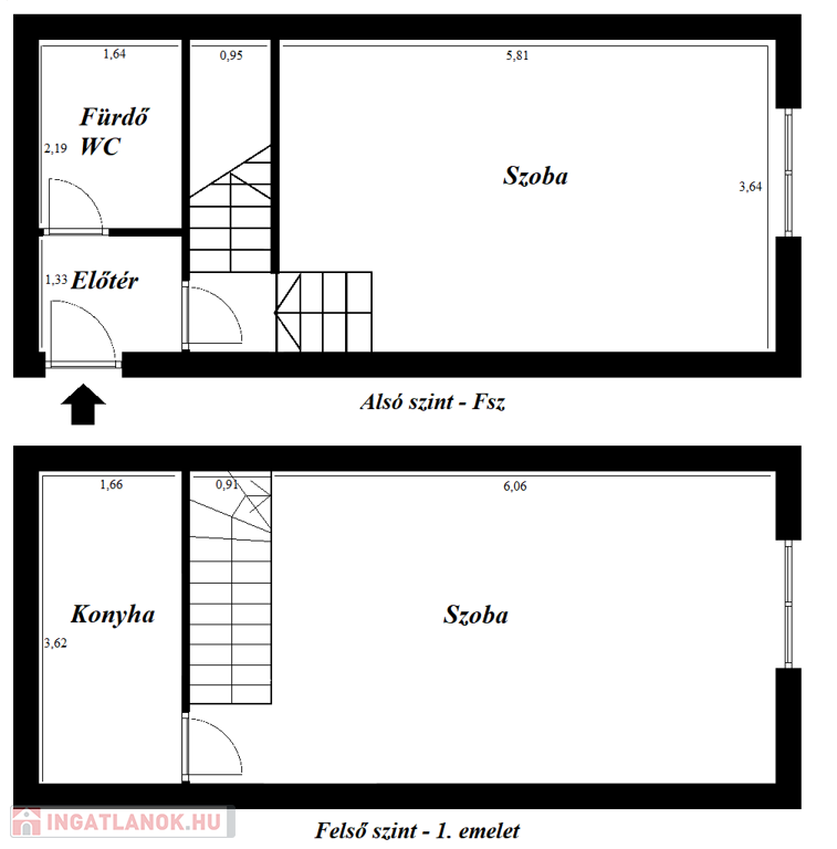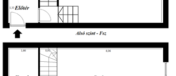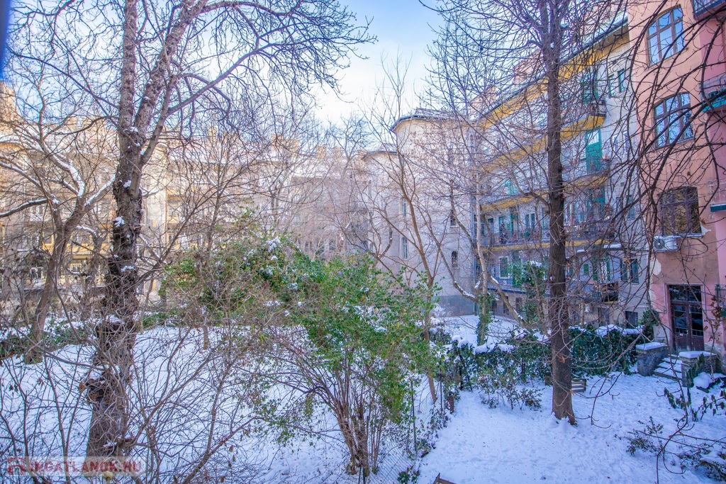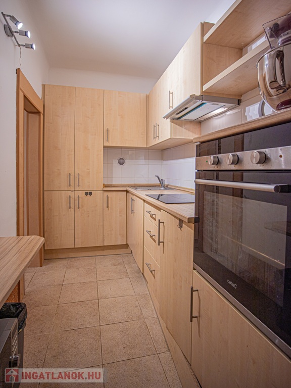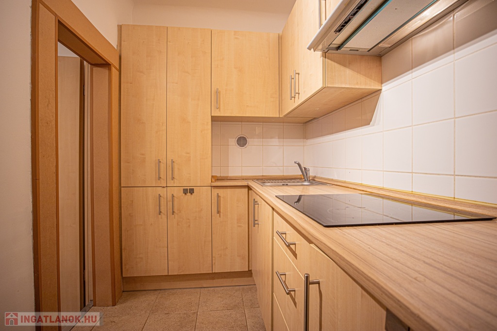 A lakás belső kétszintes, az alsó szinten található egy szoba és a fürdő/wc a felső szinten pedig a másik szoba és a konyha. Az ablakok egy csendes belső kert felé néznek.