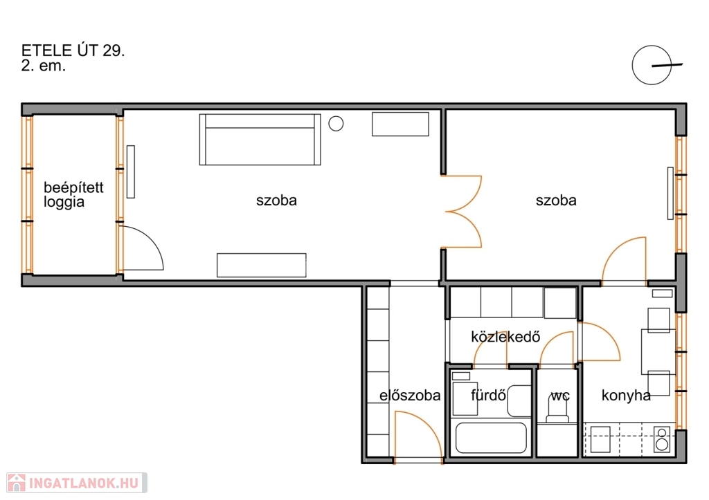 A lakás a második emeleten helyezkedik el, világos és jól átszellőztethető. Déli oldalon az Etele úttal párhuzamos zöld sávra, északi irányban a ház mögötti parkolóra és játszótérre néz.