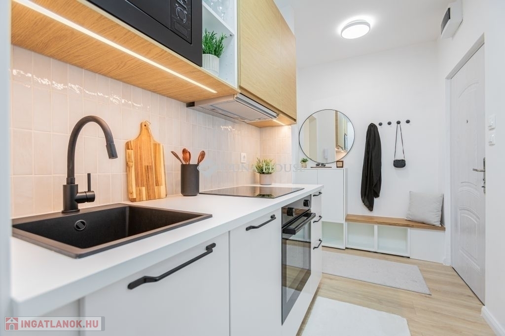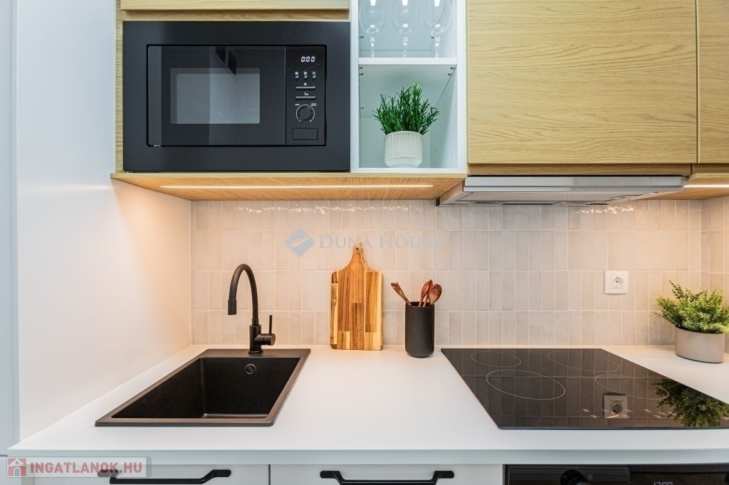 Az új, gépesített konyhabútor tartalmazza a beépített hűtőt, mosogatógépet, főzőlapot, sütőt, mikrót és elszívót.