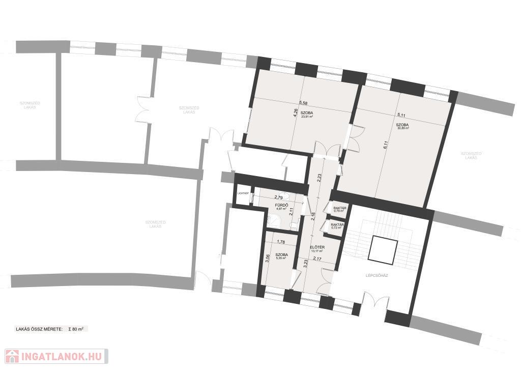 A lakás helyiségei: előszoba, konyha, 2 szoba, fürdőszoba, tárolók.
