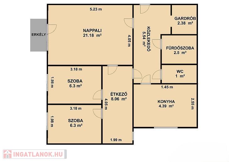1 + 2 félszoba, étkező, konyha, közlekedő, zuhanyzós fürdőszoba, mellékhelyiség, gardrób, erkély.