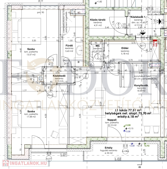 Az első emeleti lakás 75 négyzetméter hasznos alapterülettel 6 négyzetméteres erkéllyel, amerikai konyhás nappali + 2 hálószobával rendelkezik, 93,9 millió forint.
